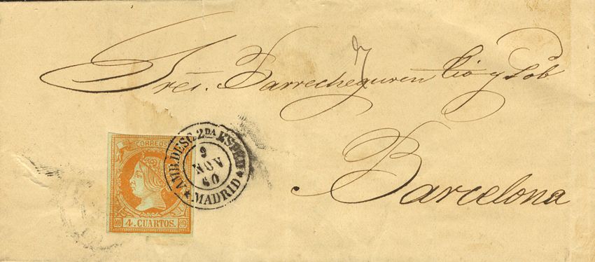 64. 1860. 4 cuartos amarillo. MADRID a BARCELONA. Matasello AMB. DESC. 2ª ESPED / *MADRID*. MAGNIFICA.