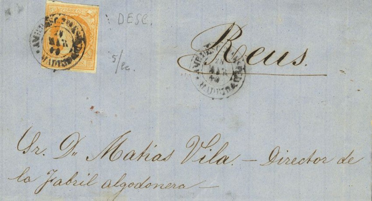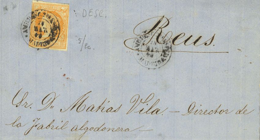 52. 1860. 4 cuartos amarillo. MADRID a REUS. Matasello AMB. DESC. 2ª ESPED /*MADRID*.