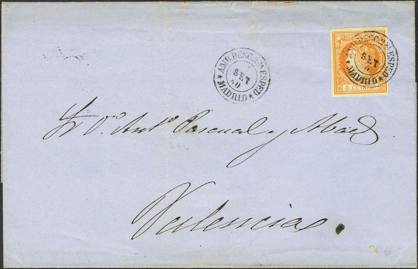 52. 1860. 4 cuartos amarillo. MADRID a VALENCIA. Matasello AMB.DESC.2ª ESPED / *MADRID*. MAGNIFICA.