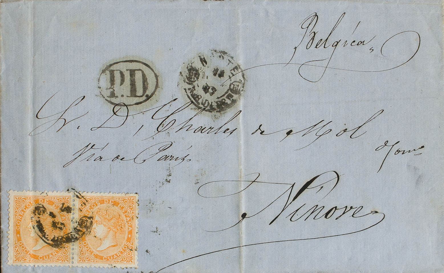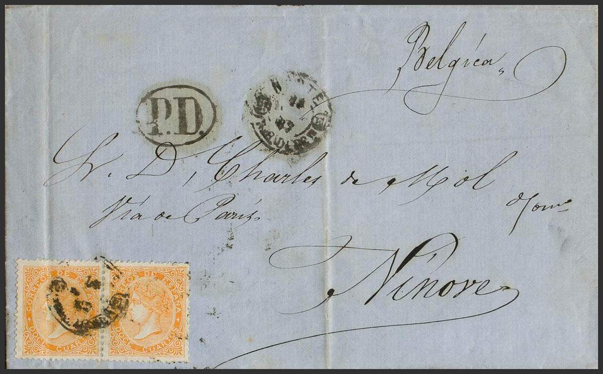 89(2). 1867. 12 cuartos naranja, pareja. VALLADOLID a NINOVE (BELGICA). El remitente franqueó la carta con 24 cuartos, utilizando la tarifa a Prusia de 24 cuartos (tal vez por cercanía) pagando 5 cuartos de exceso. MAGNIFICA Y RARA.