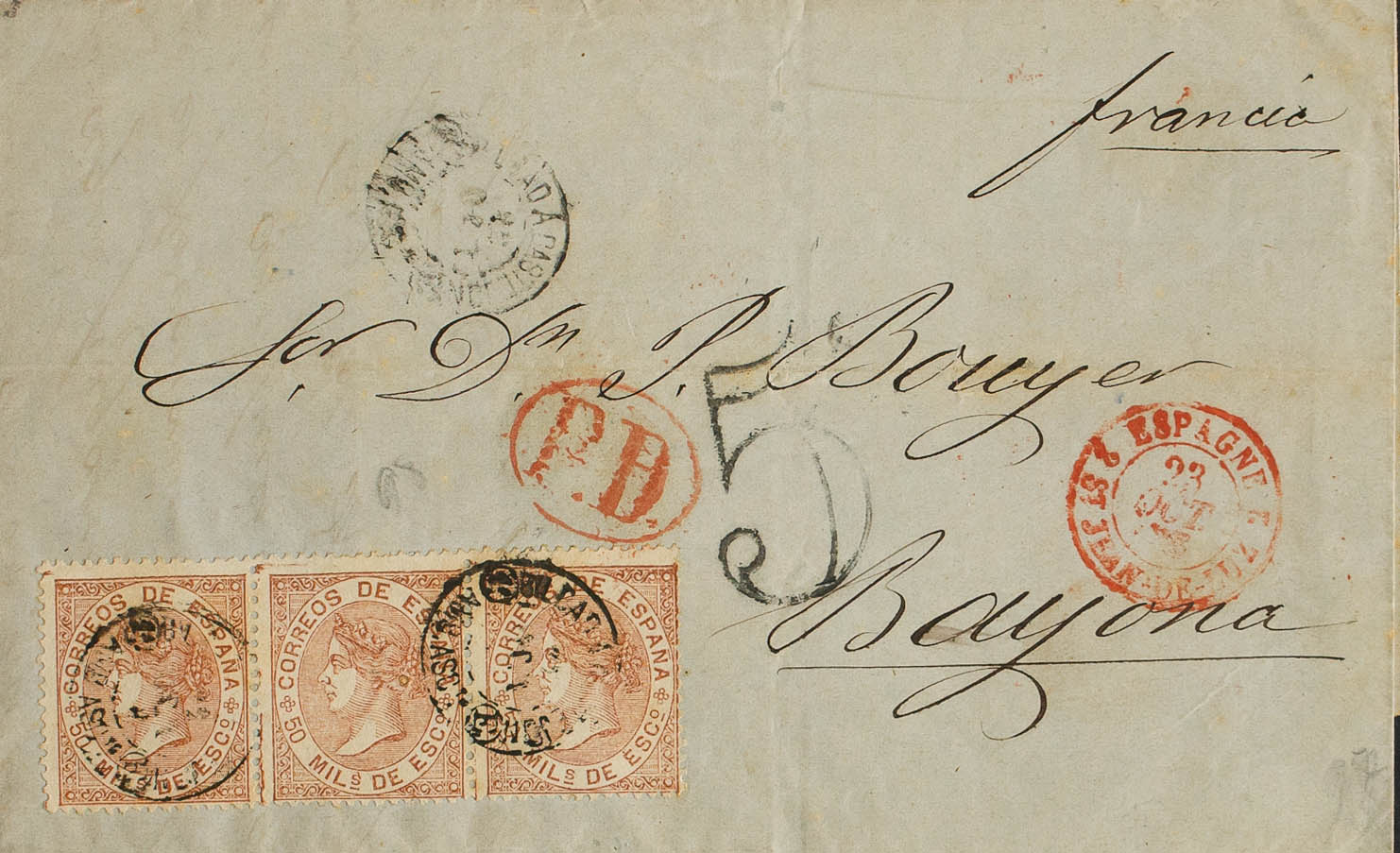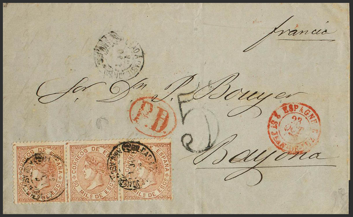 96(3). 1868. 50 mils castaño claro, tres sellos. BILBAO a BAYONA. Matasello BILBAO A CASTEJON / AMB.ASCTE. MAGNIFICA Y RARA.