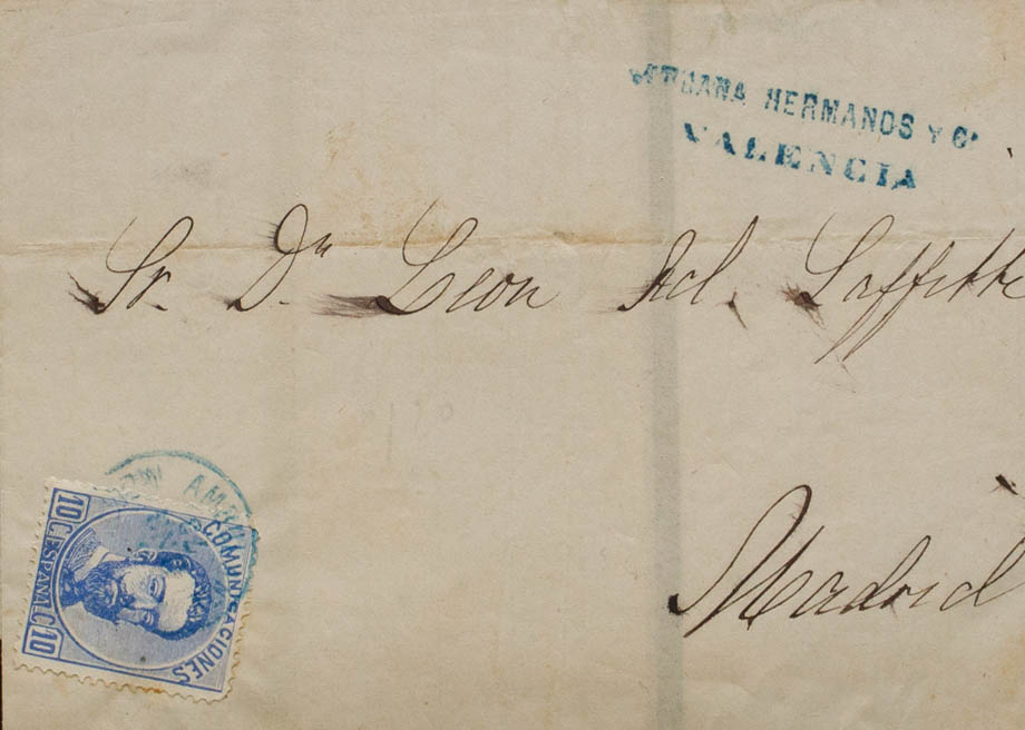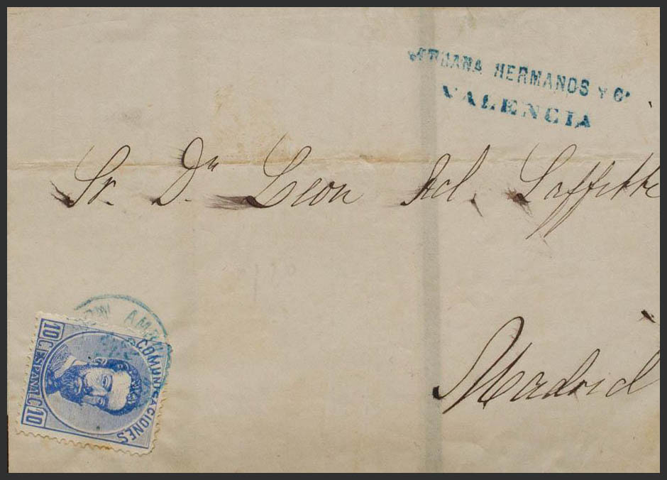 121. 1873. 10 cts ultramar. VALENCIA a MADRID. Matasello AMBULANTE / MEDITERRANEO, en azul. MAGNIFICA.