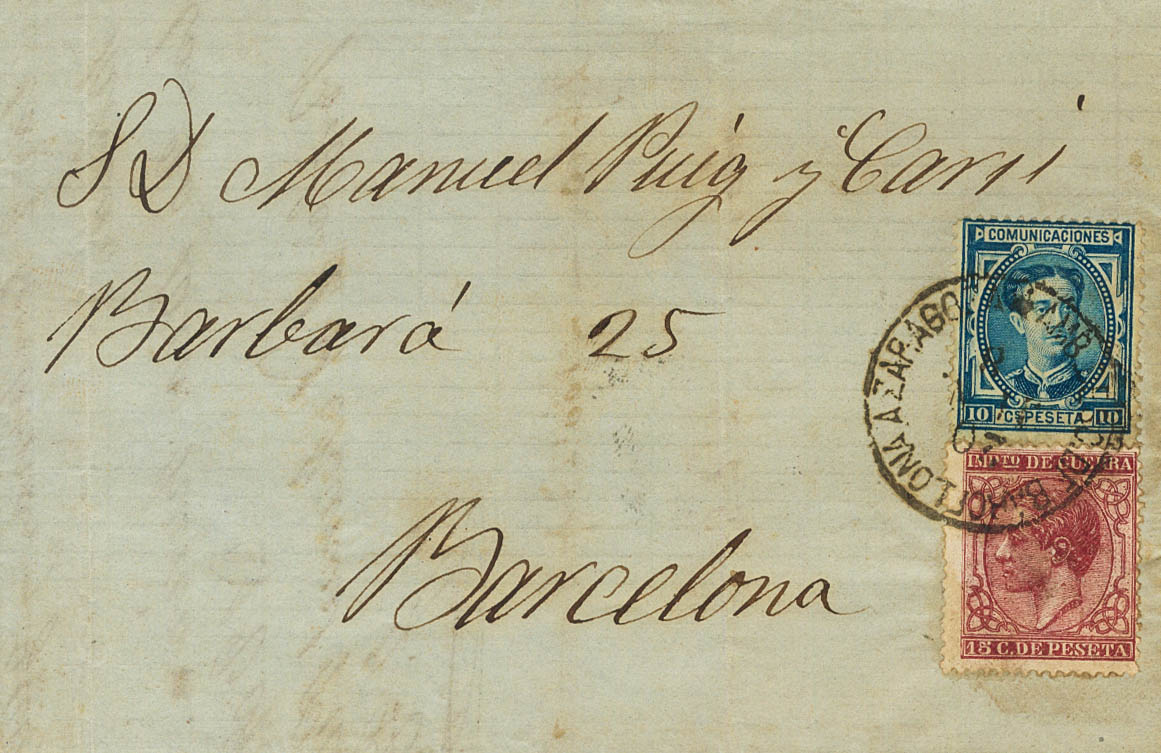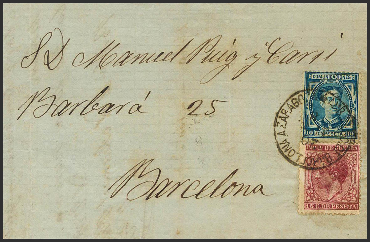 175, 188. 1878. 10 cts azul y 15 cts carmÃn. MONISTROL (BARCELONA) a BARCELONA. Matasello AMB.ASC.DE ZARAGOZA A BARCELONA. MAGNIFICA Y RARISIMA.