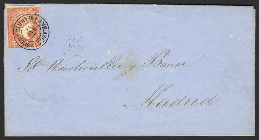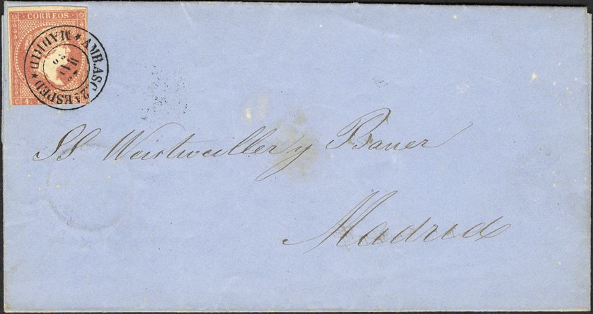 48. 1856. 4 cuartos rojo. Dirigida a MADRID. Matasello AMB.ASC.2ª ESPED / *MADRID*. MAGNIFICA.