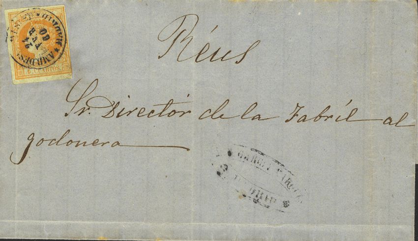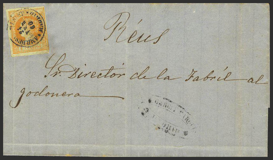 52. 1860. 4 cuartos amarillo. MADRID a REUS. Matasello AMB.ASC.2ª ESPED / *MADRID*.