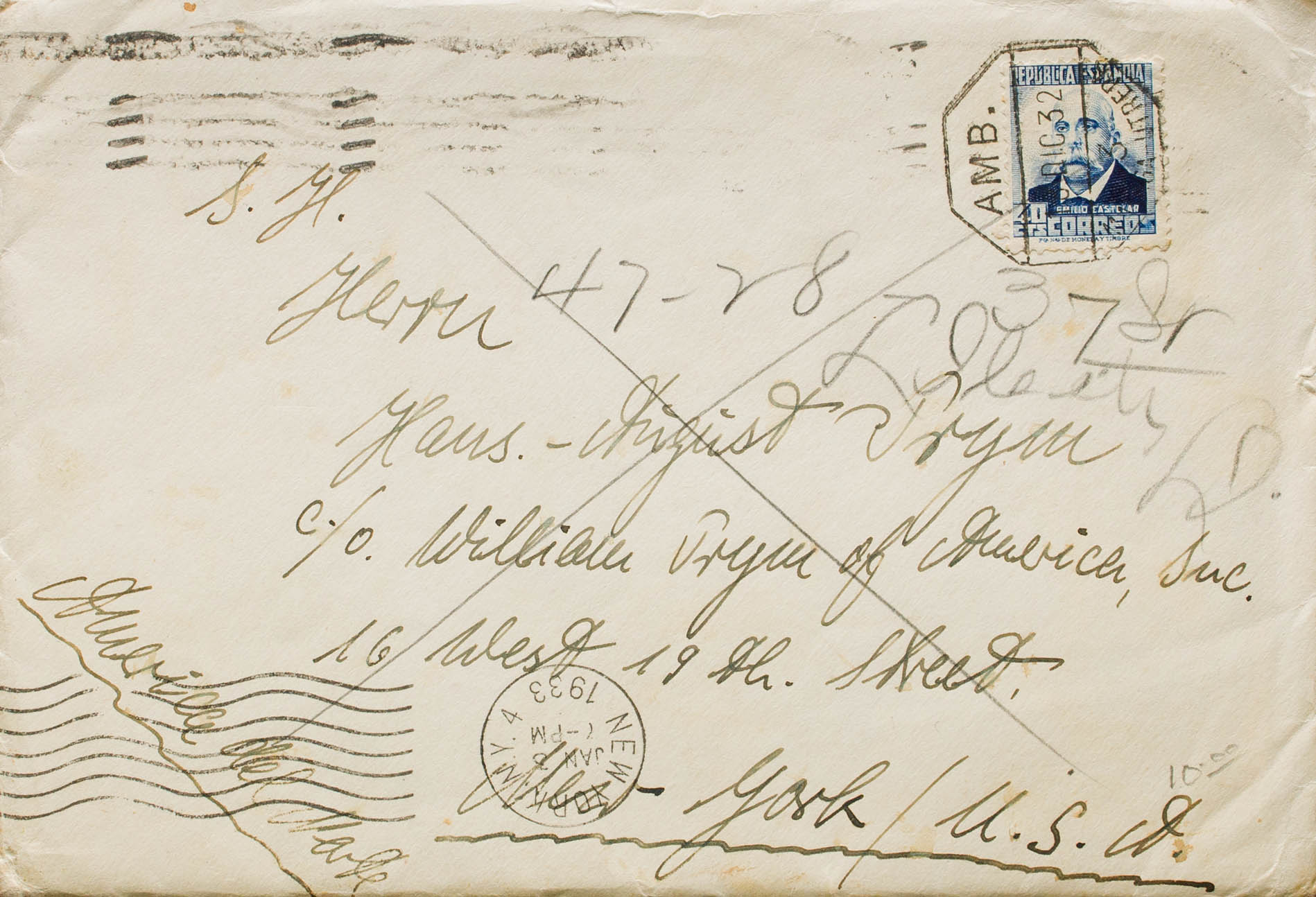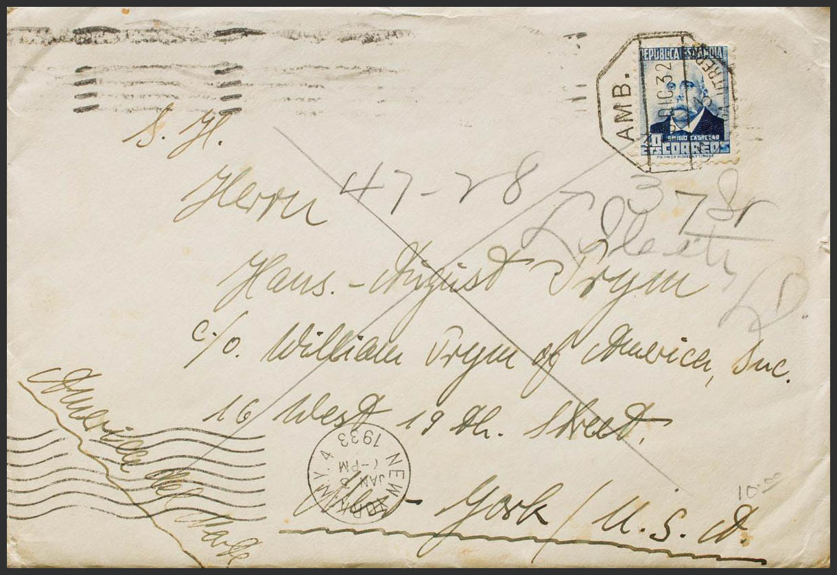 670. 1932. 40 cts azul. Carta (con texto) de MALAGA a NUEVA YORK (U.S.A.). Matasello AMB. / MALAGA-UTRERA y llegada en el frente. MAGNIFICA.