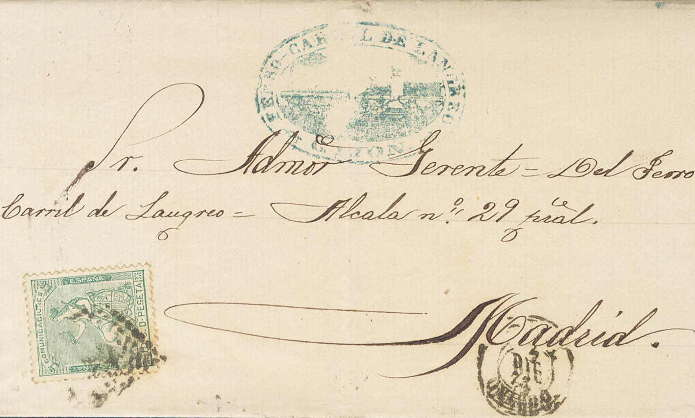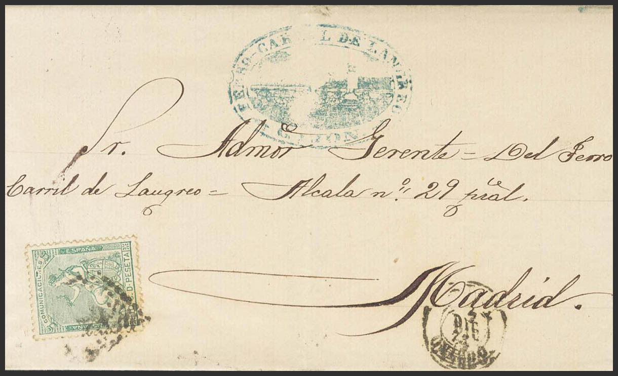 133. 1873. 10 cts verde. GIJON a MADRID. En el frente marca FERRO-CARRIL DE LANGREO / GIJON, en azul. MAGNIFICA Y RARA.