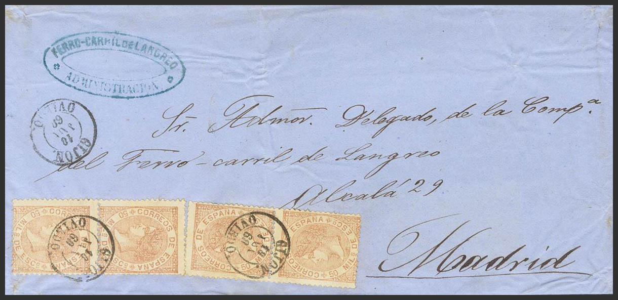 96(4). 1868. 50 mils castaño amarillo, cuatro sellos. GIJON a MADRID. Matasello GIJON / OVIEDO y en el frente marca FERRO-CARRIL DE LANGREO / ADMINISTRACION, en azul. MAGNIFICO Y RARO FRANQUEO DE CUATRO PORTES.