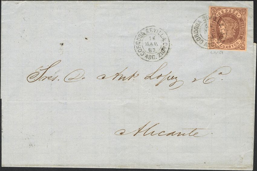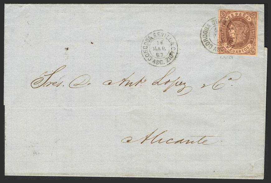 58. 1863. 4 cuartos castaño. Dirigida a ALICANTE. Matasello SEVILLA CADIZ / ASC. MAGNIFICA.