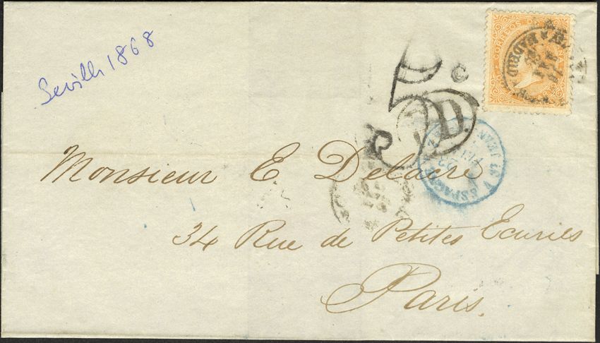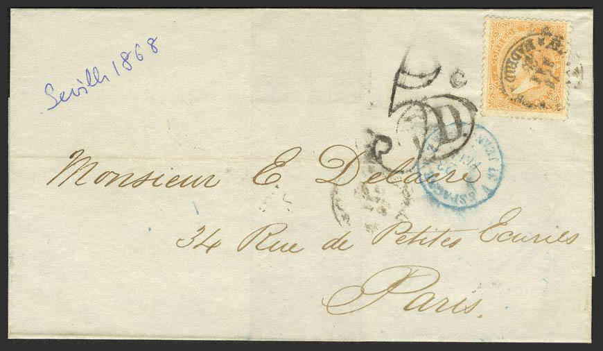 89. 1868. 12 cuartos. SEVILLA a PARIS (FRANCIA). Matasello AMB. 2ª. ESPED. / *MADRID*. MAGNIFICA.
