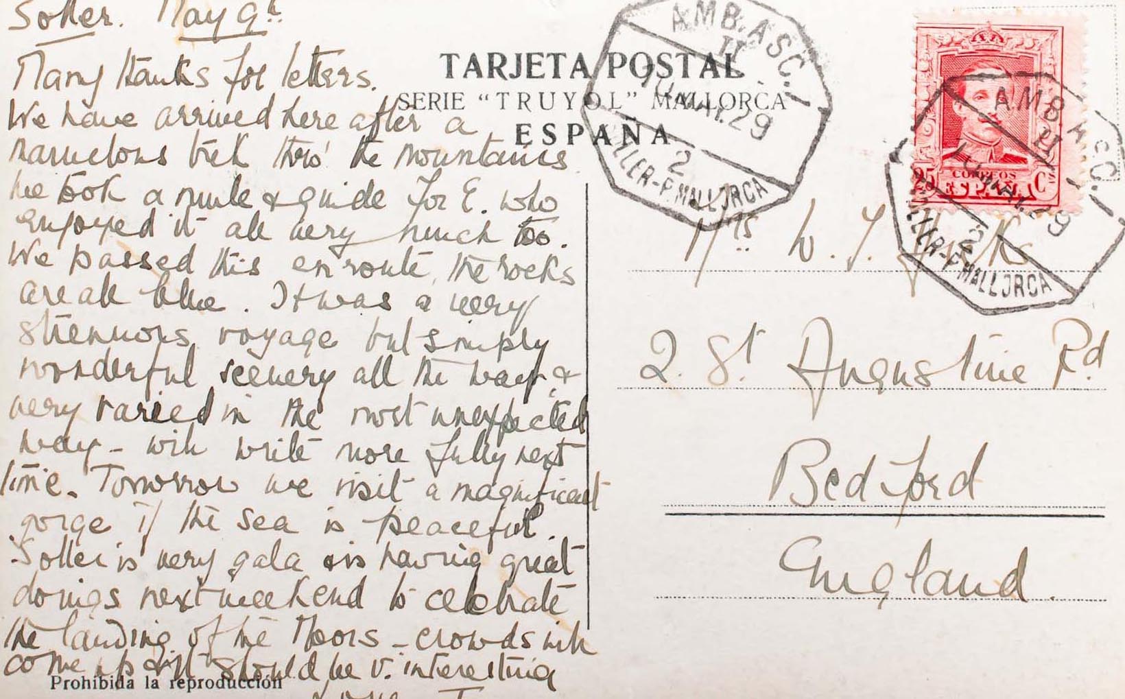 317A. 1929. 25 cts rojo. Tarjeta Postal de SOLLER a BEDFORD (GRAN BRETAÑA). Matasello AMB.ASC. / II / SOLLER-P.MALLORCA. MAGNIFICA.