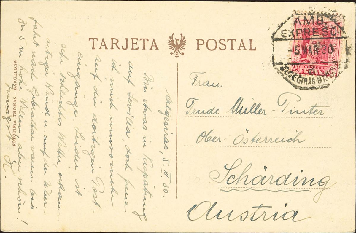 317. 1930. 25 cts carmín. Tarjeta Postal de ALGECIRAS a SCHARDING (AUSTRIA). Matasello AMB / EXPRESO / 3 / ALGECIRAS-MADRID. MAGNIFICA.