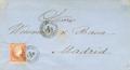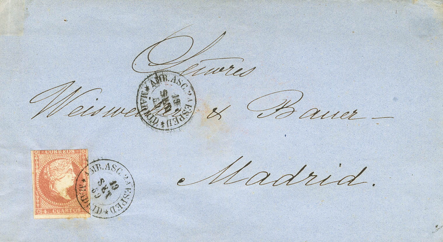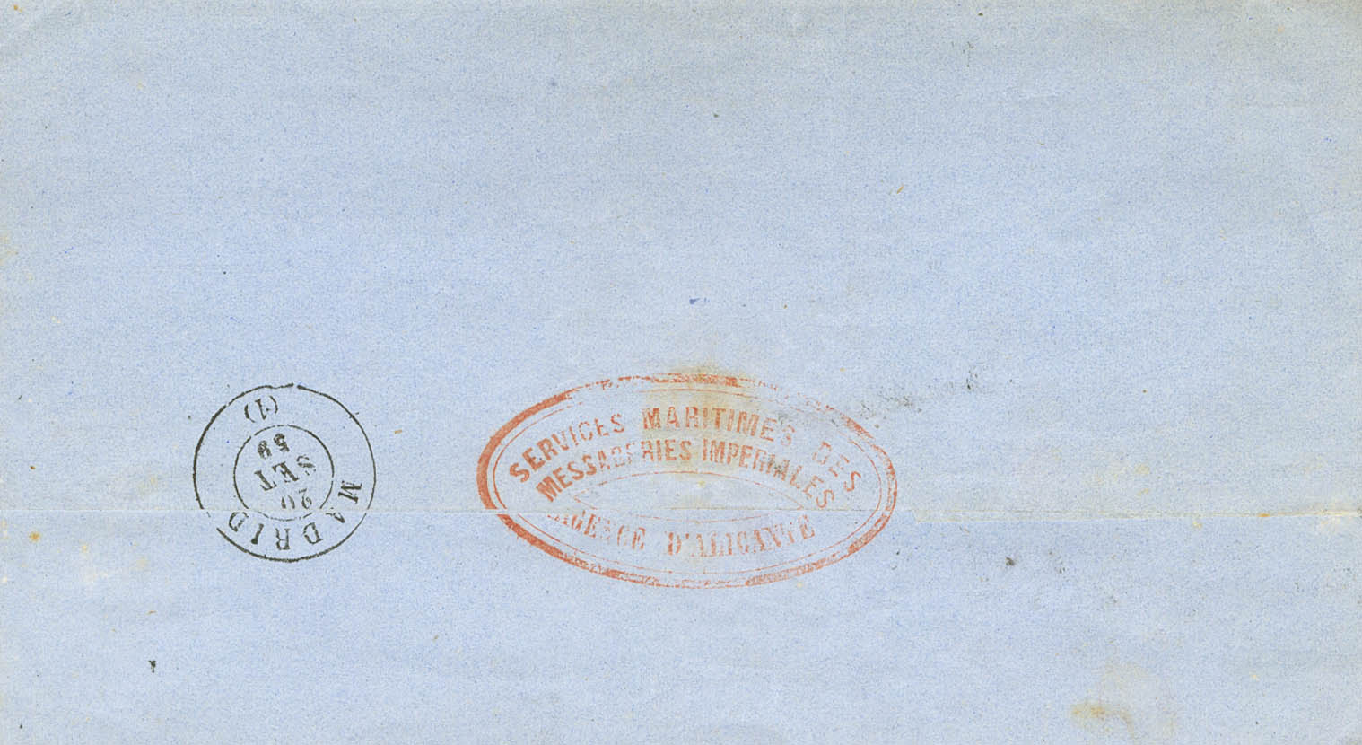 48. 1859. 4 cuartos rojo. ISLAS BALEARES (dato no corfirmado) a MADRID. Al dorso marca MESSAGERIES IMPERIALES / AGENCE D´ALICANTE, esta empresa con delegación en Alicante recortaba en dos o tres dÃas el tránsito entre Baleares y Madrid, la correspondencia se redirigÃa privadamente hasta Alicante desde Mallorca y allà la depositaban en el ambulante. MAGNIFICA Y RARA.