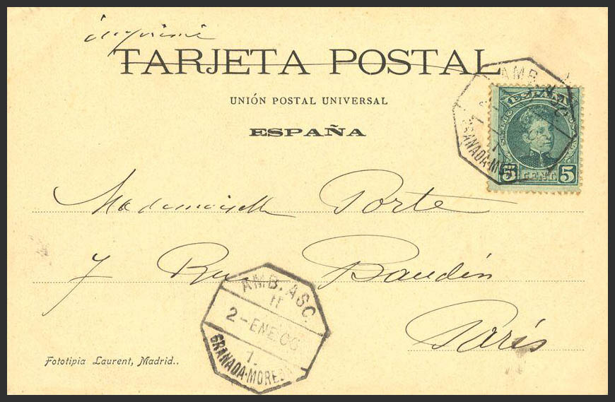 242. 1906. 5 cts verde. Tarjeta Postal de GRANADA a PARIS. Matasello AMB.-ASC.II / GRANADA-MOREDA. MAGNIFICA.