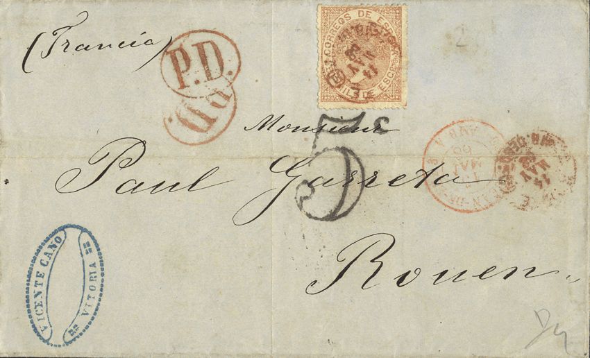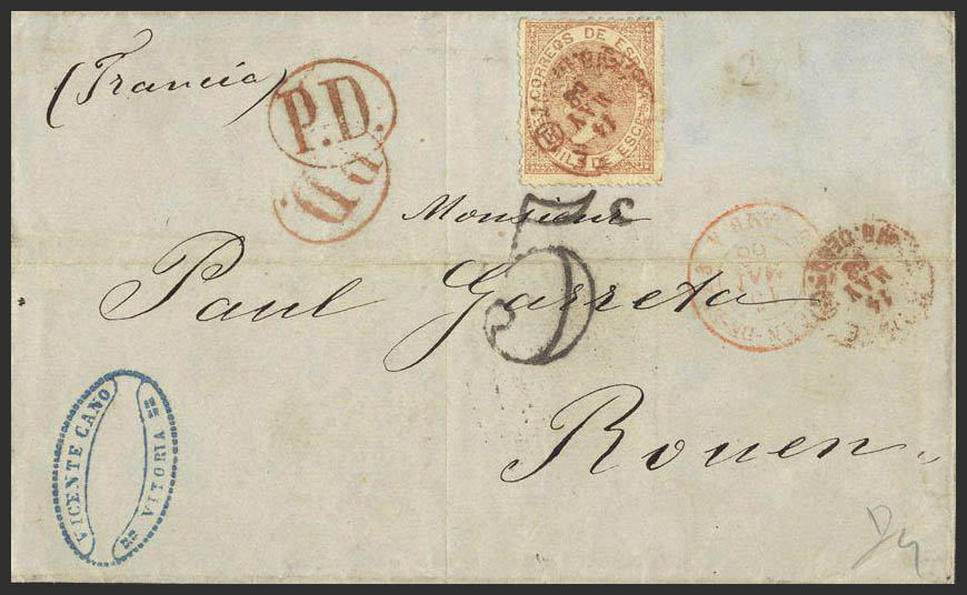 96. 1868. 50 mils castaño. VITORIA a ROUEN (FRANCIA). Matasello NORTE / AMB. DESC., en rojo. MAGNIFICO.