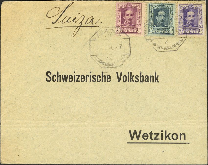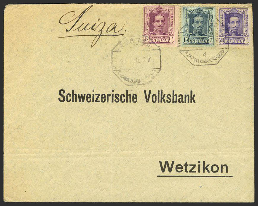 311, 315, 316. 1927. 5 cts, 15 cts y 20 cts. BARCELONA a WETZIKON (SUIZA). Matasello AMB. ASC. / S. JUAN DE LAS ABADESAS-BARNA. MAGNIFICA.