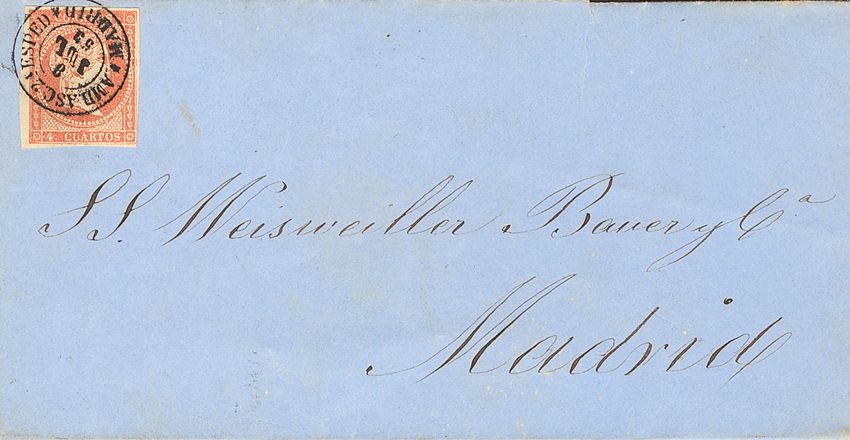 48. 1859. 4 cuartos rojo. Dirigida a MADRID. Matasello AMB. ASC. 2ª ESPED / * MADRID *. MAGNIFICA.
