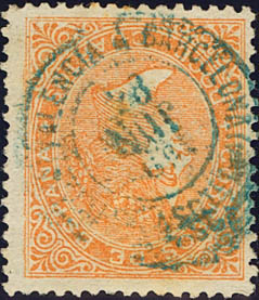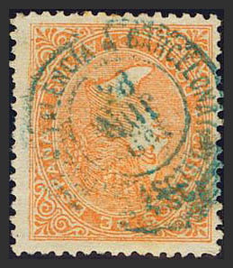 89A. 1867. 12 cuartos naranja. Matasello VALENCIA A BARCELONA / AMB. ASCT, en azul. MAGNIFICO Y RARO.