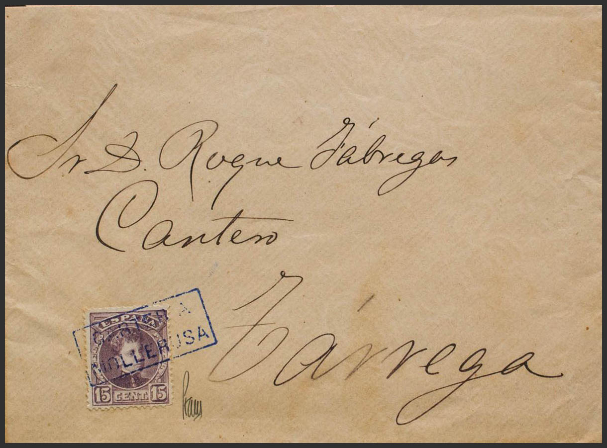 245. (1901ca). 15 cts lila castaño. MOLLERUSA a TARREGA. Matasello CARTERIA / MOLLERUSA, en azul. MAGNIFICA Y RARA.
