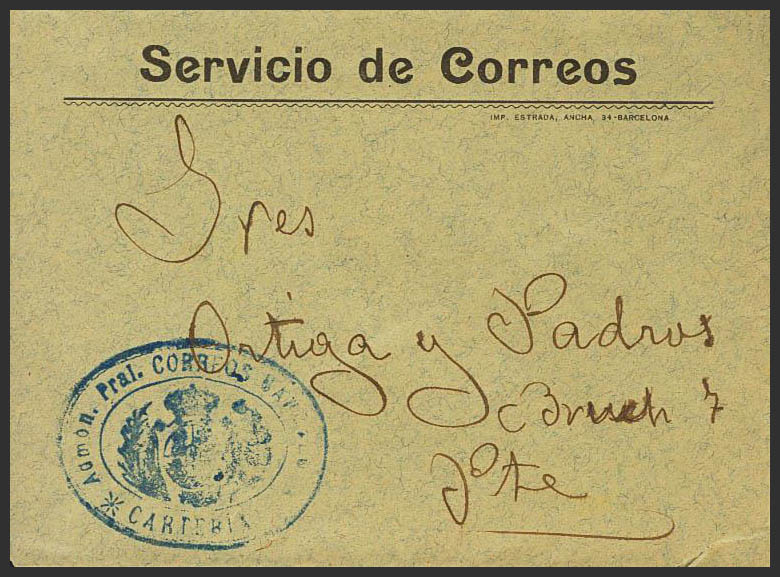 (1918ca). Correo Interior de BARCELONA. Marca de franquicia ADMON PRAL CORREOS BARCELONA / *CARTERIA*. MAGNIFICA Y RARA.
