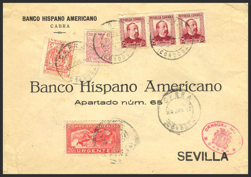 679, 685(3), Fis 92. 1937. 20 cts rojo, 25 cts carmín, tira de tres y 30 cts rosa MOVIL. CABRA a SEVILLA. Al dorso tránsito y llegada. MAGNIFICA.