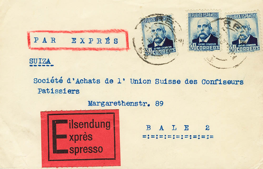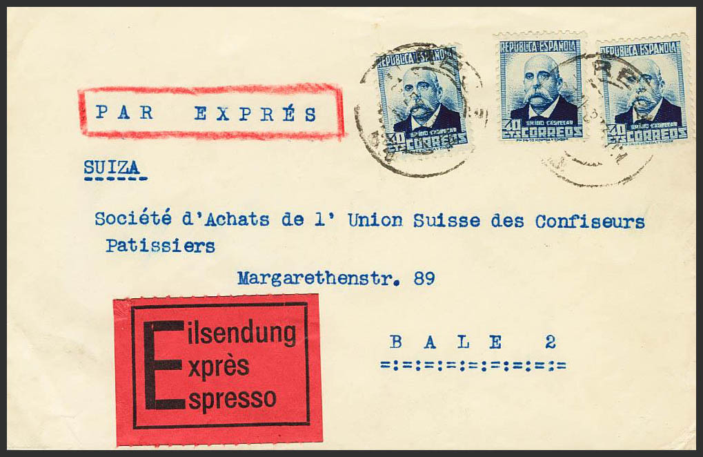 670(3). 1933. 40 cts azul, tres sellos. Correo Urgente de REUS a BASILEA (SUIZA). Al dorso llegada. MAGNIFICA.