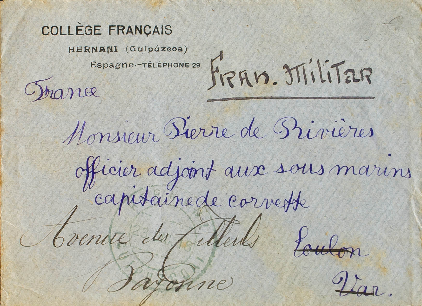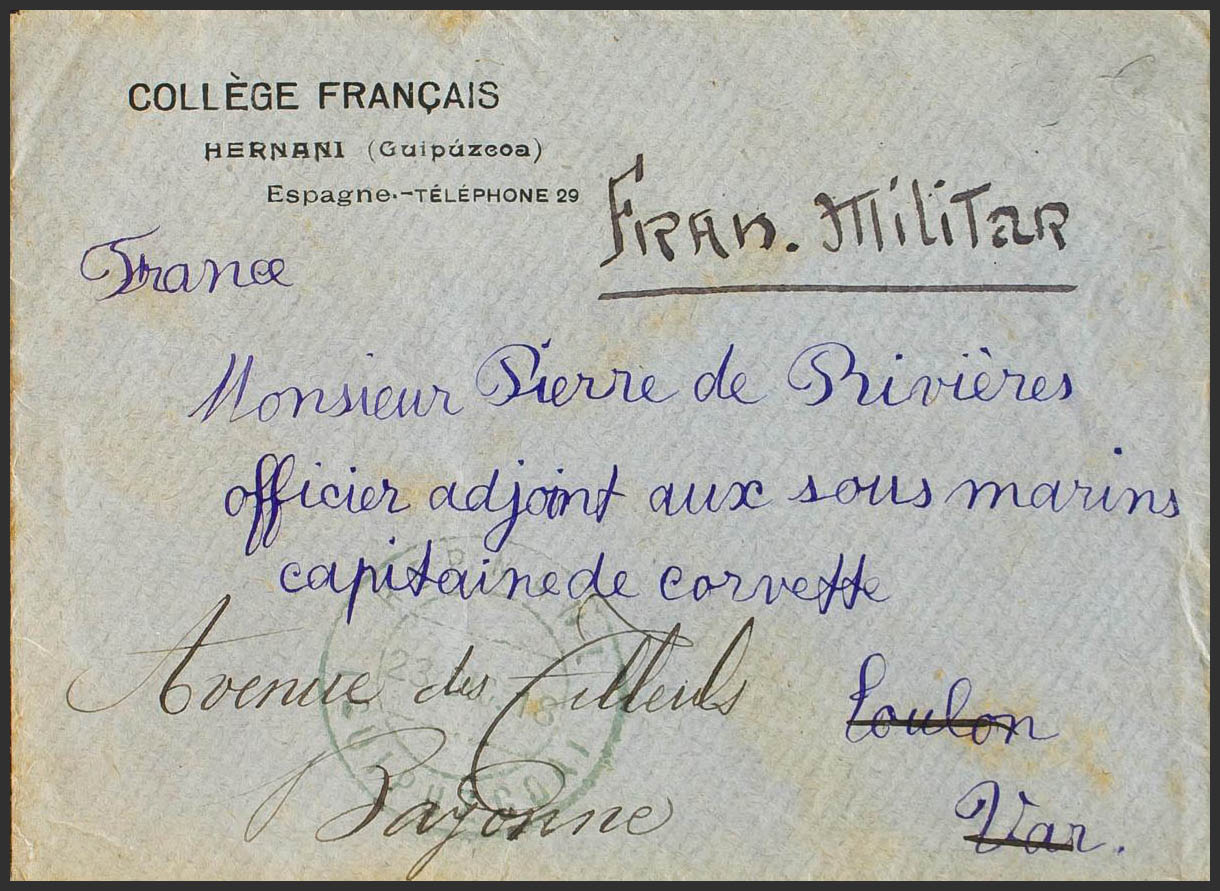 1918. HERNANI a TOULON (FRANCIA), y reexpedida a BAYONA. Matasello HERNANI / (GUIPUZCOA), en azul y manuscrito "Franquicia Militar", correspondiente a la I Guerra Mundial. MAGNIFICA Y RARA.