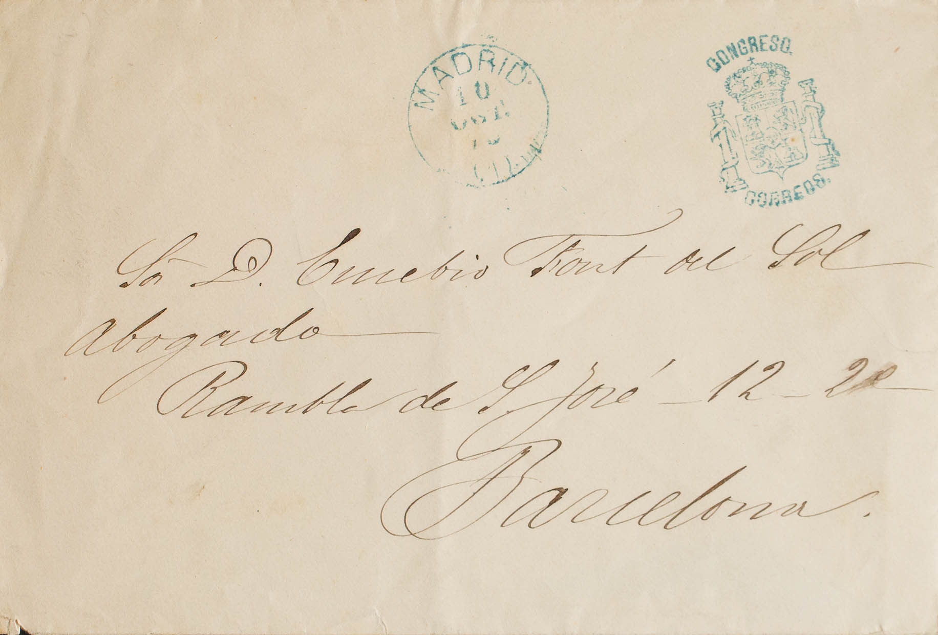 1876. MADRID a BARCELONA. Marca de franquicia CONGRESO / CORREOS y fechador MADRID / (1), ambos en azul. MAGNIFICA.