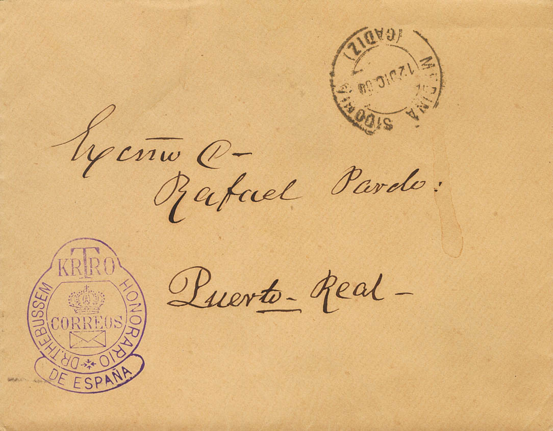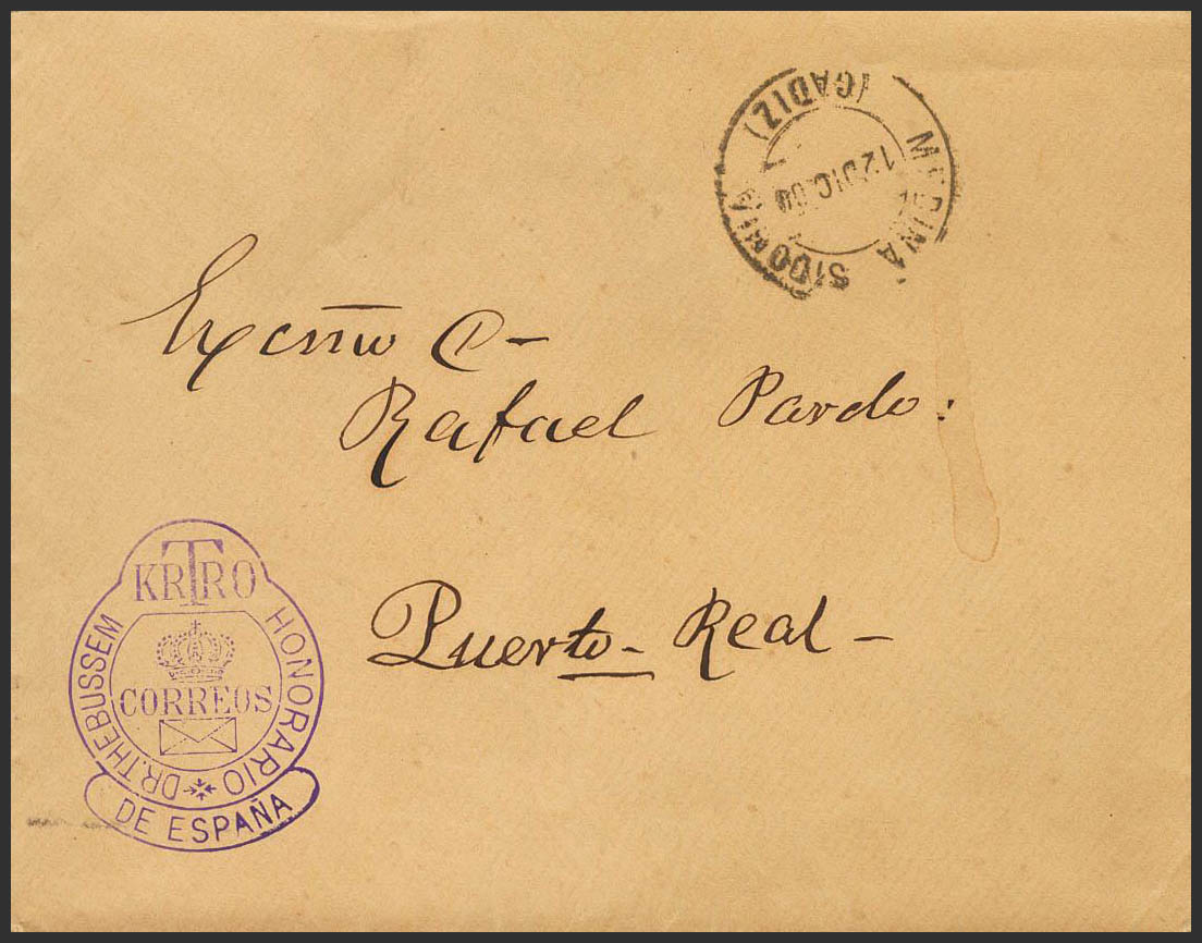 5. 1900. MEDINA-SIDONIA a PUERTO REAL. Marca DOCTOR THEBUSSEM / CARTERO HONORARIO / DE ESPAÑA, en violeta y al dorso llegada. MAGNIFICA.