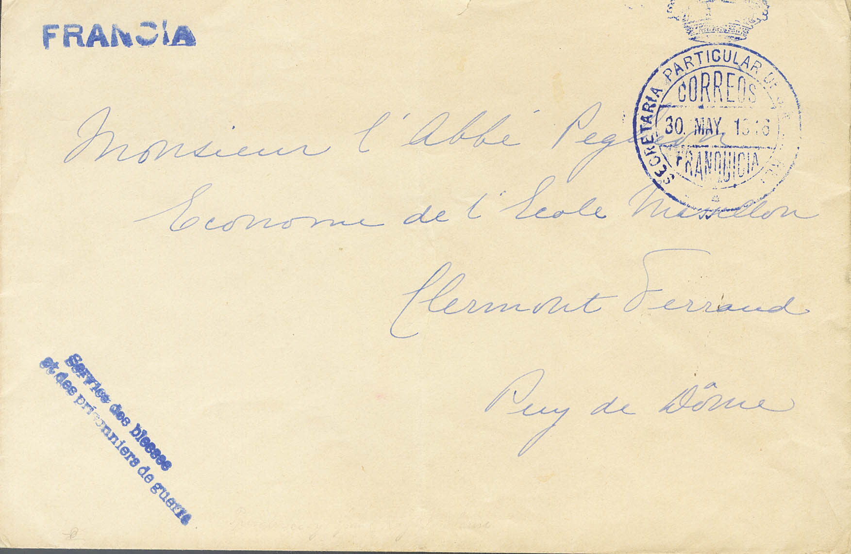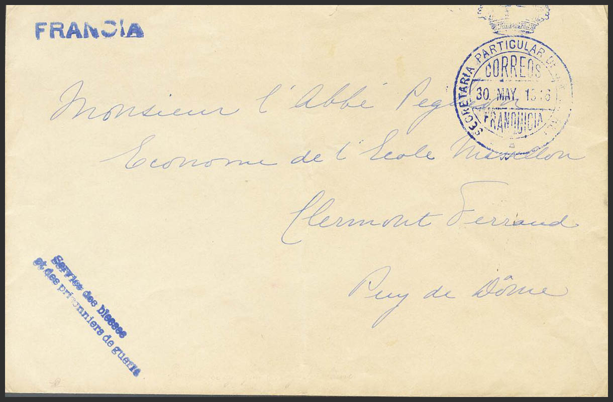 1916. MADRID a CLERMONT FERRAND (FRANCIA). Marca de franquicia SECRETARIA PARTICULAR DE S.M. EL REY y SERVICE DES BLESSES / ET DES PRISIONNIERS DE GUERRE, ambas en azul y dirigida a una de las personas que solicita ayuda humanitaria a S.M. el Rey Alfonso XIII. MAGNIFICA Y MUY RARA, EL REY FUE PROPUESTO COMO CANDIDATO AL PREMIO NOBEL DE LA PAZ, ENTRE OTROS MOTIVOS POR SU ACTIVISMO A FAVOR DE LAS VICTIMAS DE LA I GUERRA MUNDIAL.