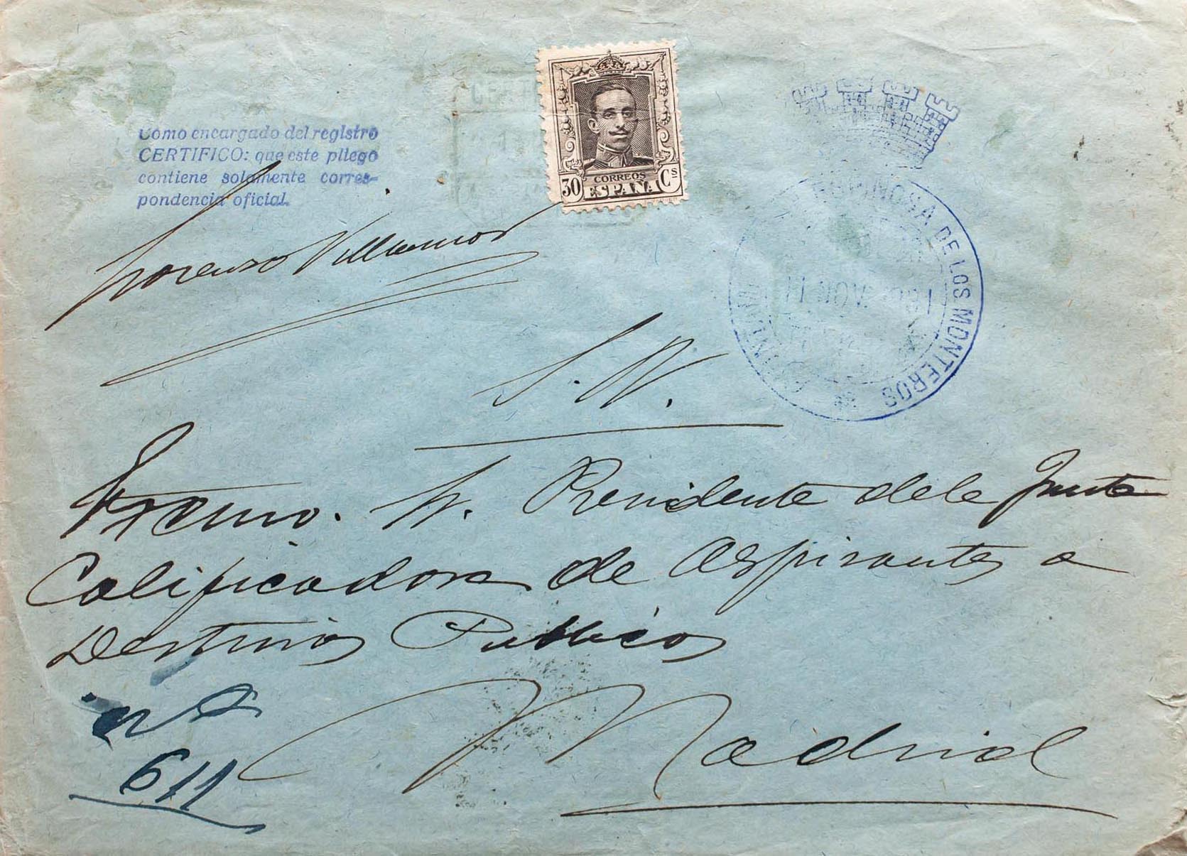 Franquicia. AYUNTAMIENTO ESPINOSA DE LOS MONTEROS, al dorso tránsito. MAGNIFICA.