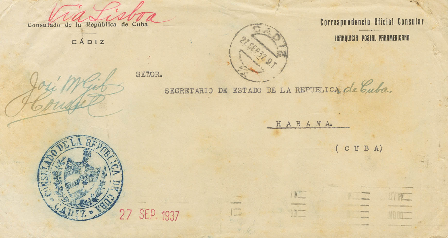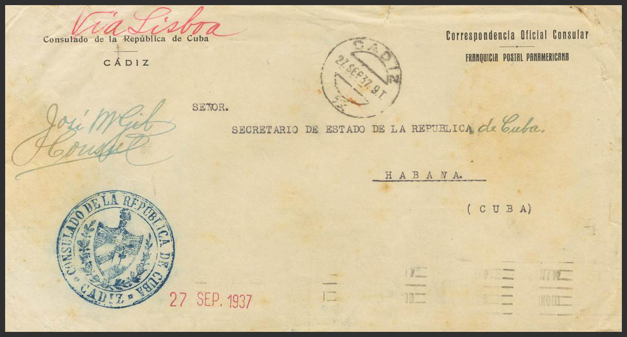 1937. Certificado de CADIZ a LA HABANA (CUBA). Marca del Consulado de Cuba, en azul y sobreimpresión CORRESPONDENCIA OFICIAL CONSULAR / FRANQUICIA POSTAL PANAMERICANA, al dorso rodillo de tránsito por Vigo y llegada. BONITA Y RARA.