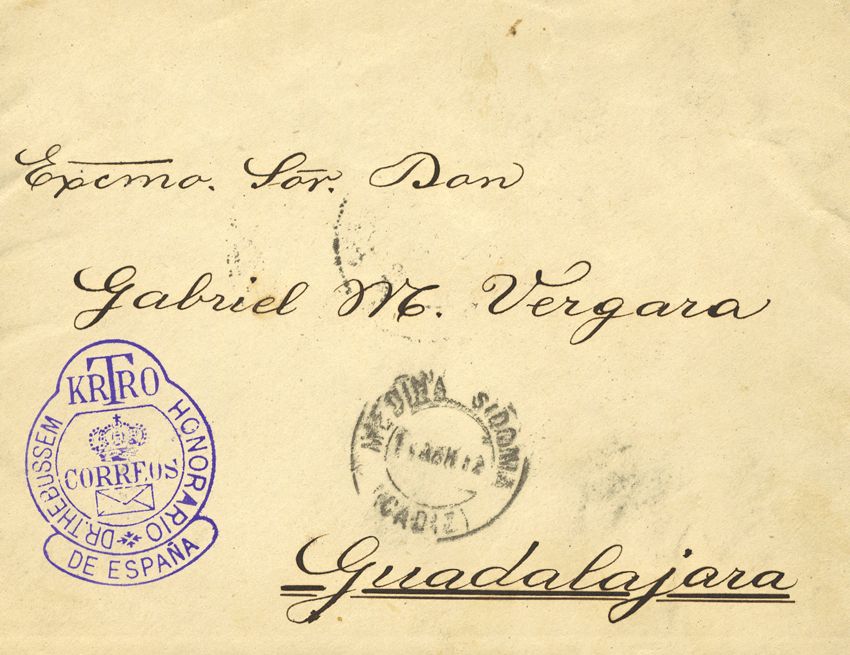 1912. MEDINA-SIDONIA a GUADALAJARA. Circulada con franquicia del Dr. Thebussem. MAGNIFICA Y RARA.