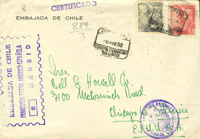 Franquicia. EMBAJADA DE CHILE / FRANQUICIA POSTAL AMERICO-ESPAÑOLA, al dorso llegada. MAGNIFICA Y RARA.