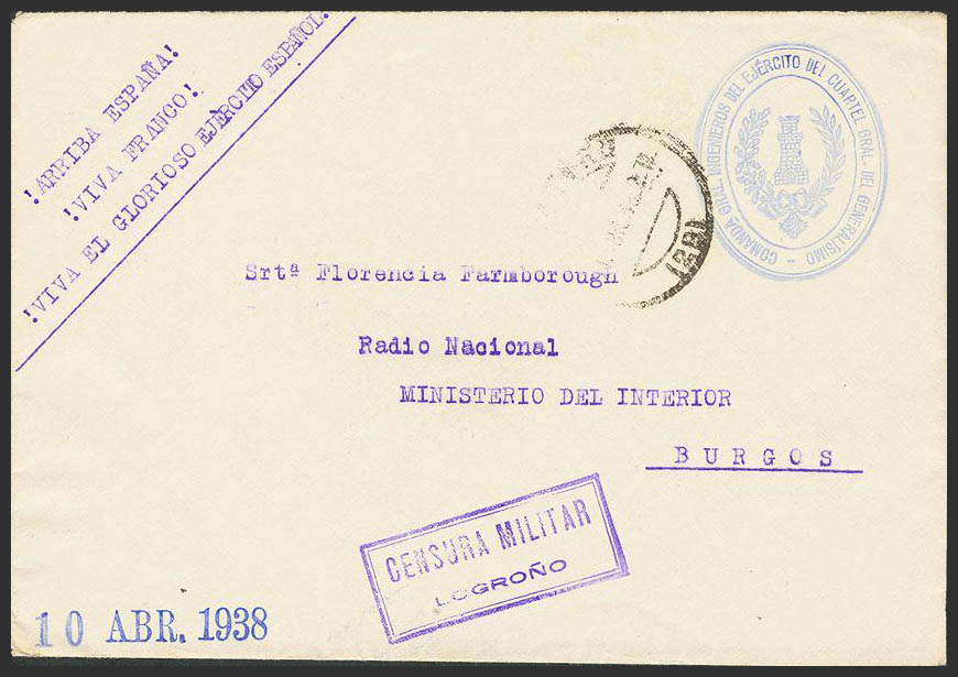 Franquicia. COMANDª GRAL INGENIEROS DEL EJERCITO DEL CUARTEL GRAL DEL GENERALISIMO. Al dorso llegada. MAGNIFICA.