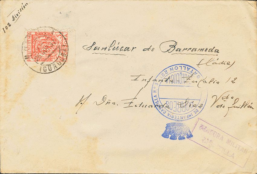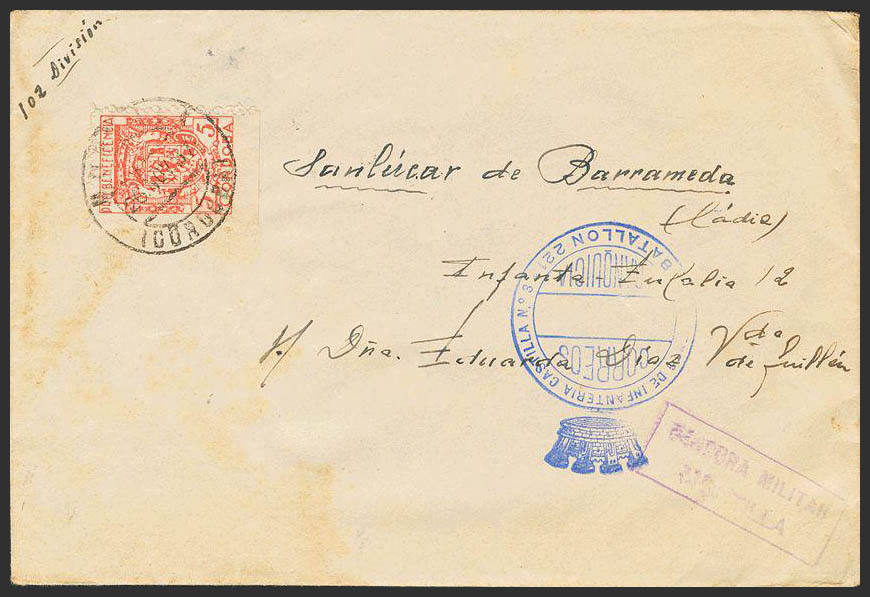 Franquicia. REGIMIENTO DE INFANTERIA CASTILLA Nº3 / BATALLON 21, al dorso llegada. MAGNIFICA.
