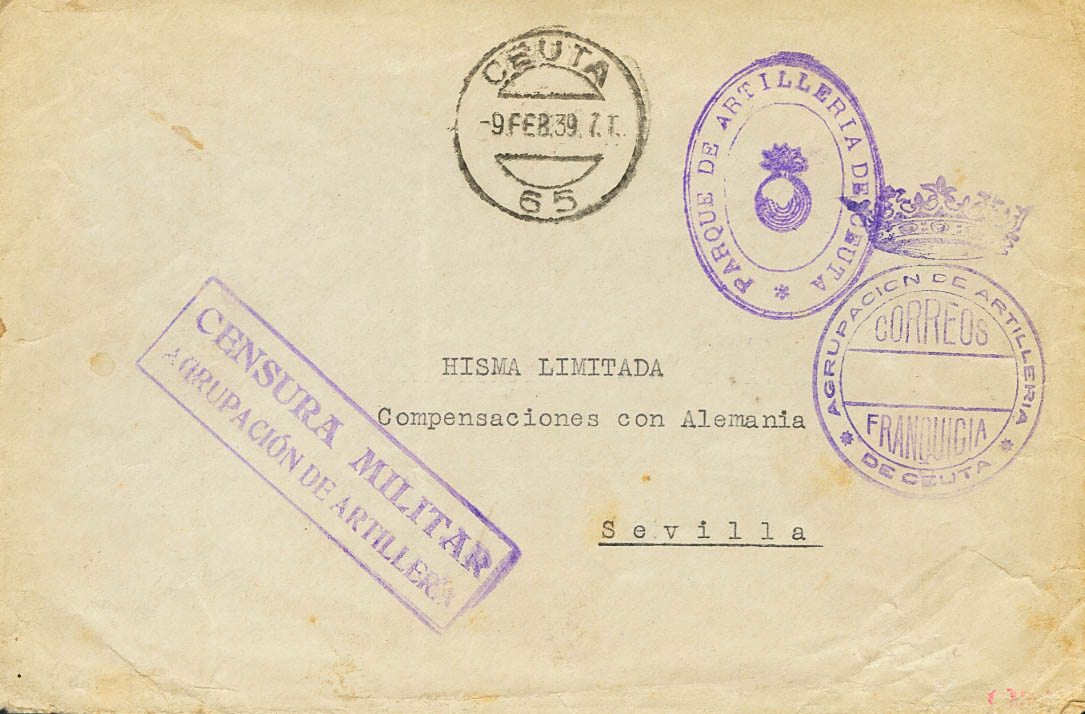 1939. CEUTA a SEVILLA. Marca AGRUPACION DE ARTILLERIA / DE CEUTA, de franquicia y PARQUE DE ARTILLERIA DE CEUTA, en violeta. MAGNIFICA Y RARA.
