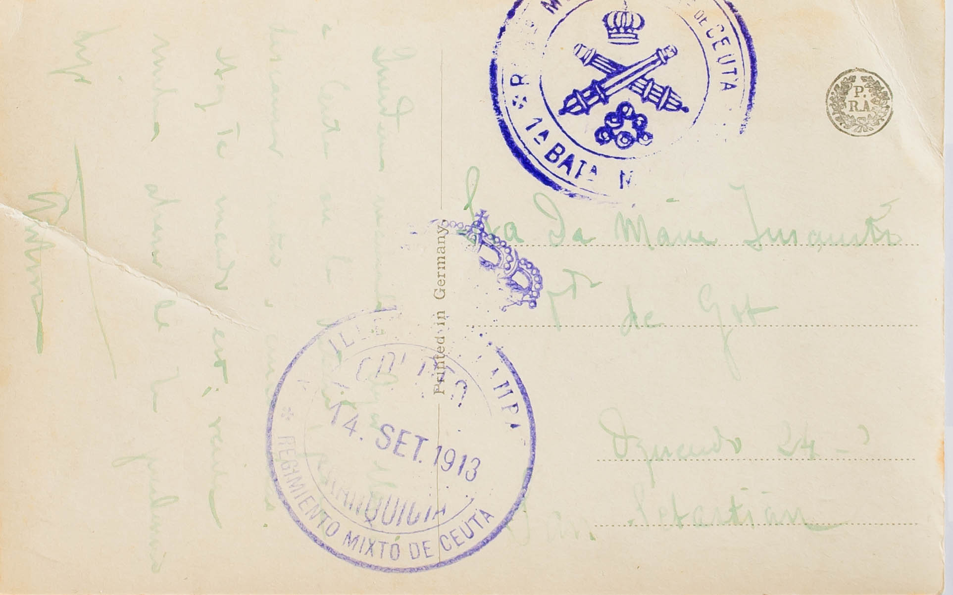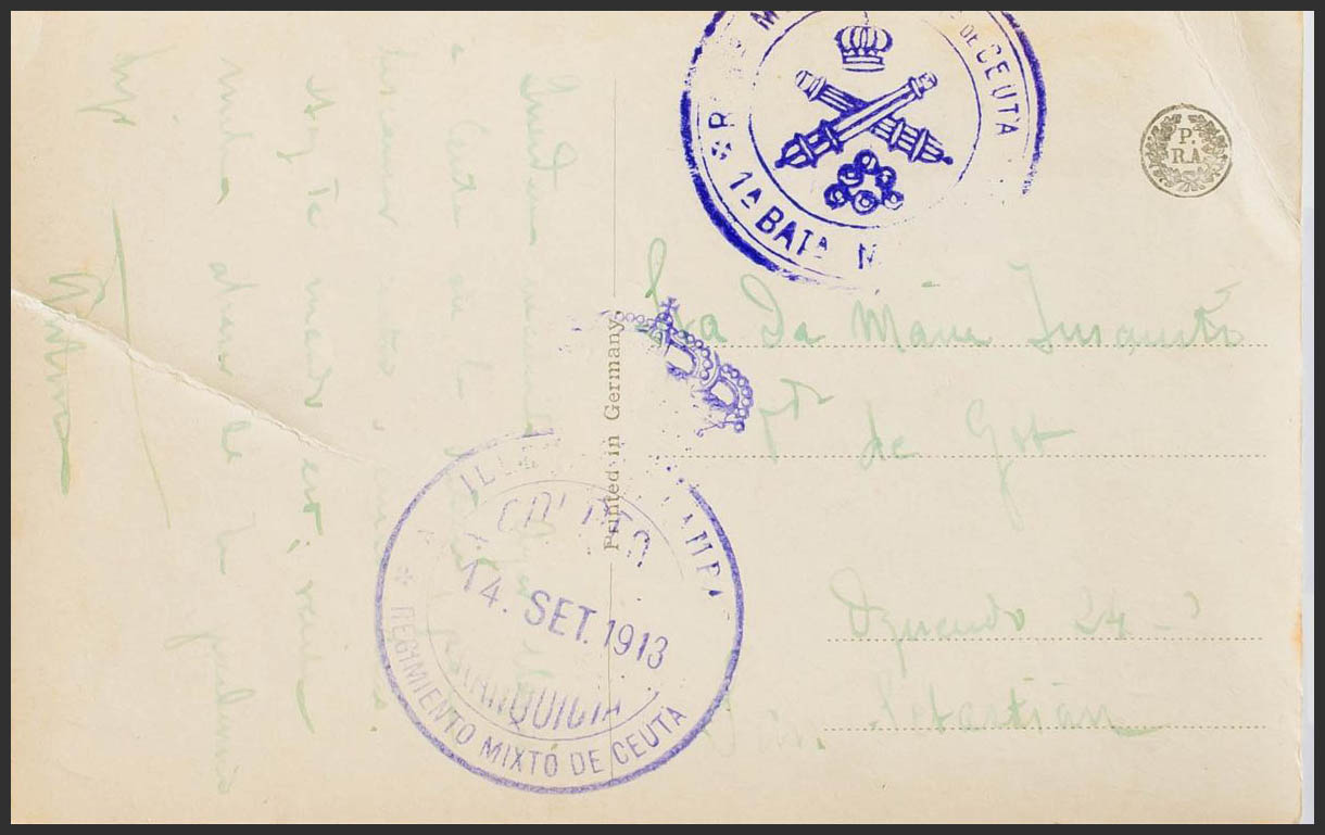 1913. Tarjeta Postal dde CEUTA a SAN SEBASTIAN. Marca de Franquicia ARTILLERIA DE CAMPAÑA / REGIMIENTO MIXTO DE CEUTA y marca del Regimiento de Artillería de Ceuta, ambas en violeta y llegada al dorso. MAGNIFICA Y RARA.