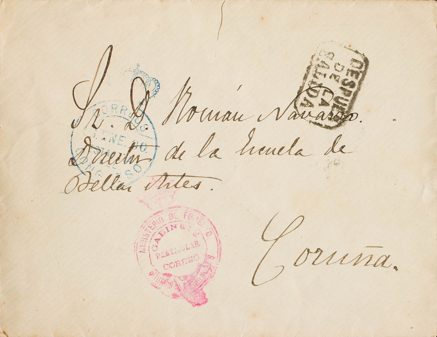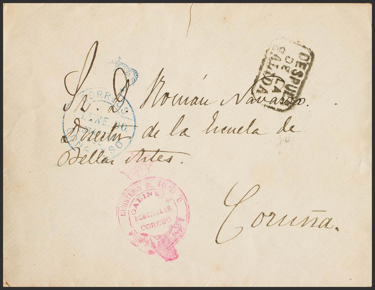 1900. MADRID a LA CORUÑA. Marca de franquicia MINISTERIO DE FOMENTO / GABINETE / PARTICULAR / CORREO, en violeta, fechador CORREOS / ESTAFETA / DEL / CONGRESO, en azul y marca DESPUES / DE LA / SALIDA. MAGNIFICA Y RARA.
