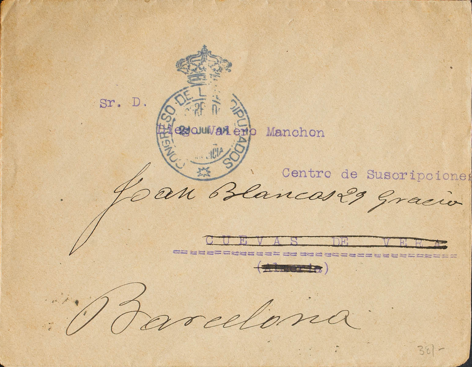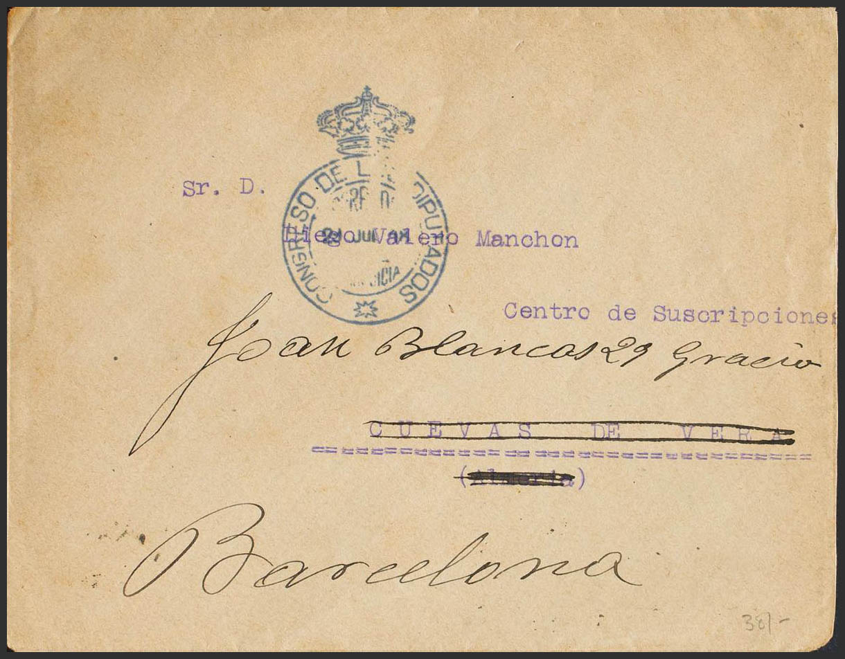 1918. MADRID a CUEVAS DE VERA, reexpedida a BARCELONA. Marca de franquicia CONGRESO DE LOS DIPUTADOS / CORREOS / FRANQUICIA, en azul y al dorso tránsito y llegada. MAGNIFICA.
