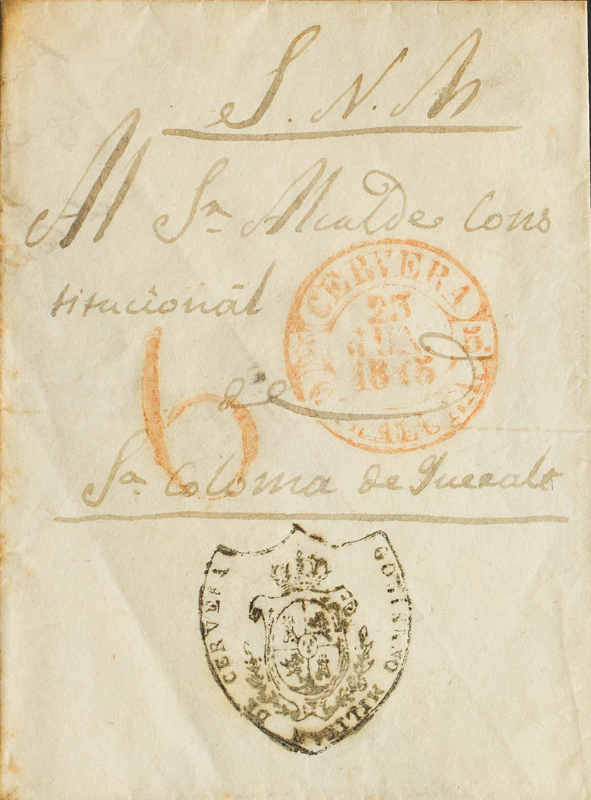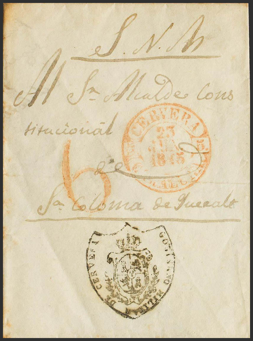 1845. CERVERA a SANTA COLOMA DE QUERALT. Marca de franquicia GOBIERNO MILITAR DE CERVERA. MAGNIFICA Y RARA, ESPECIALMENTE EN ESTA ESPECTACULAR CALIDAD.