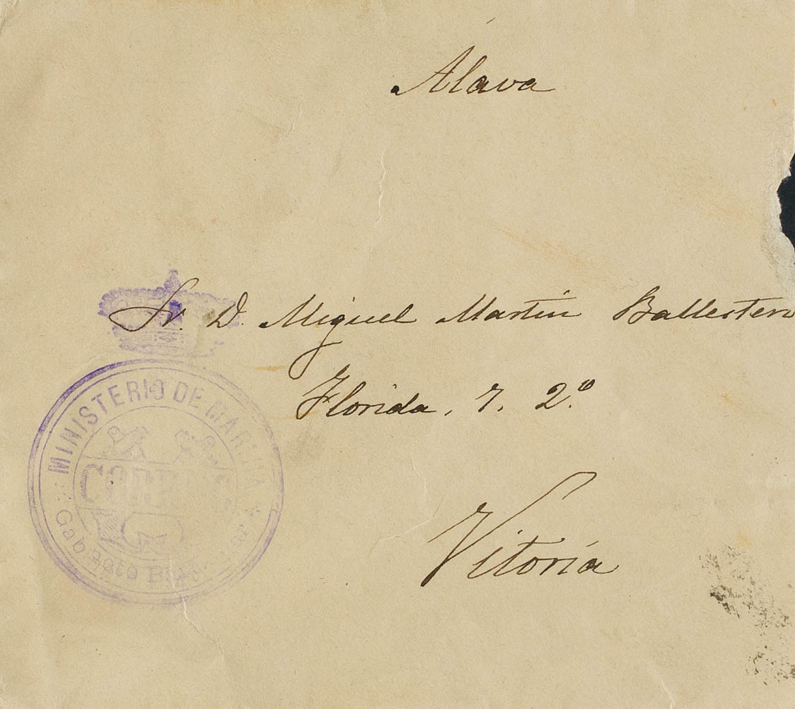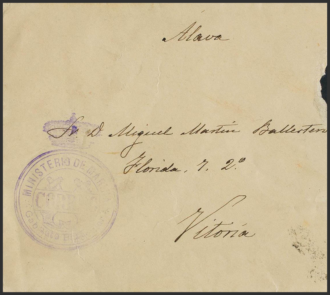 1906. Dirigida a VITORIA. Marca de franquicia MINISTERIO DE MARINA / CORREO / GABINETE PARTICULAR, en violeta y al dorso llegada. MAGNIFICA Y RARA.