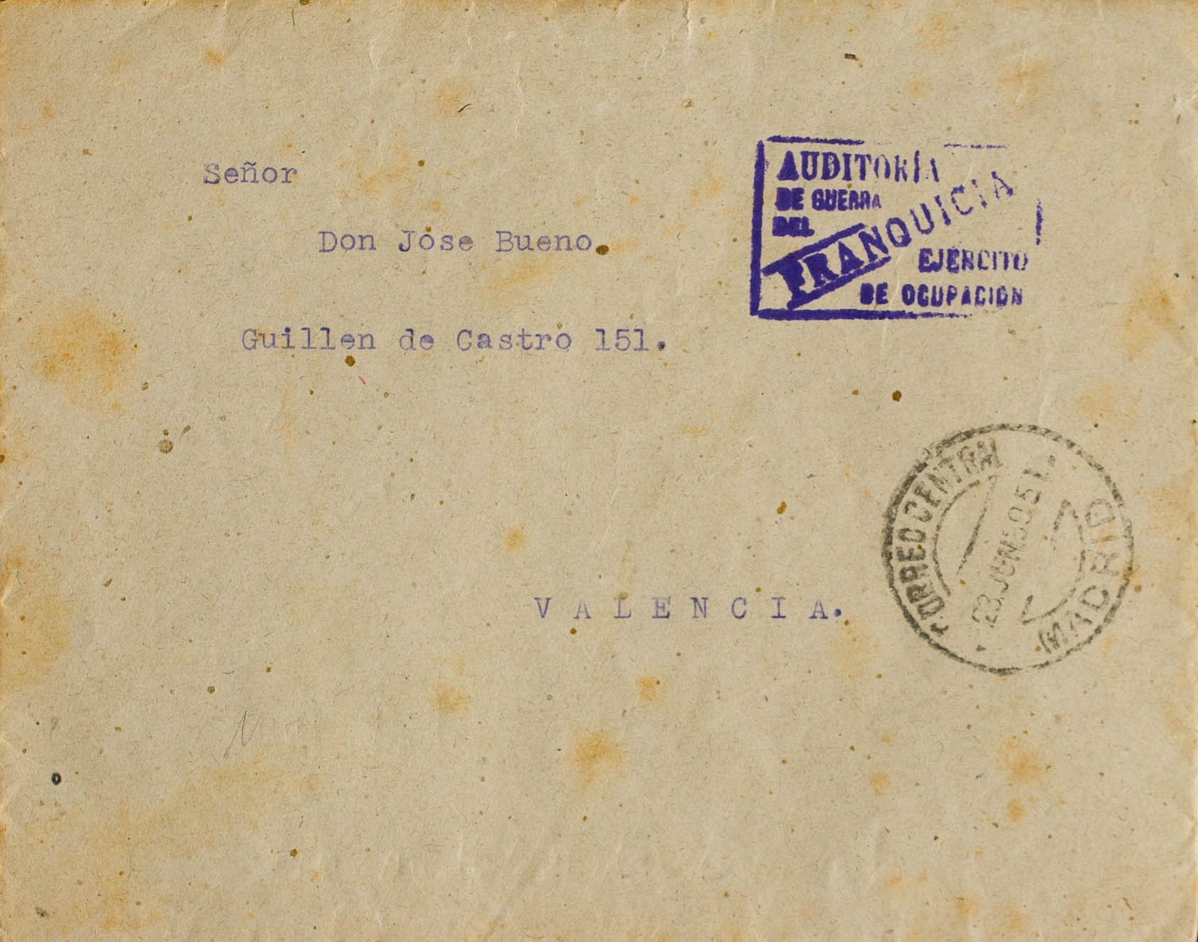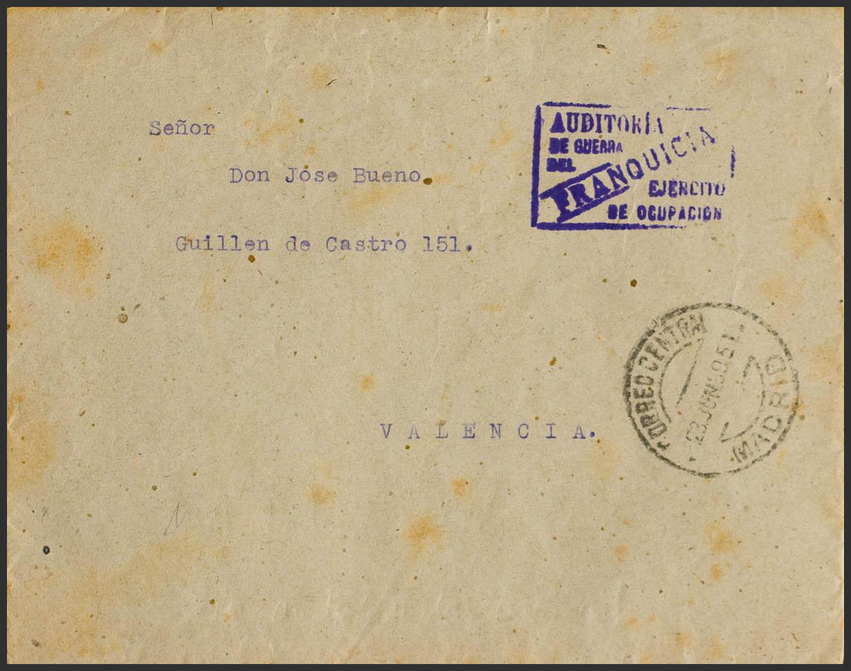 1939. MADRID a VALENCIA. Marca de franquicia AUDITORIA / DE GUERRA / DEL EJERCITO DE OCUPACION, en violeta y al dorso llegada. MAGNIFICA Y RARISIMA.