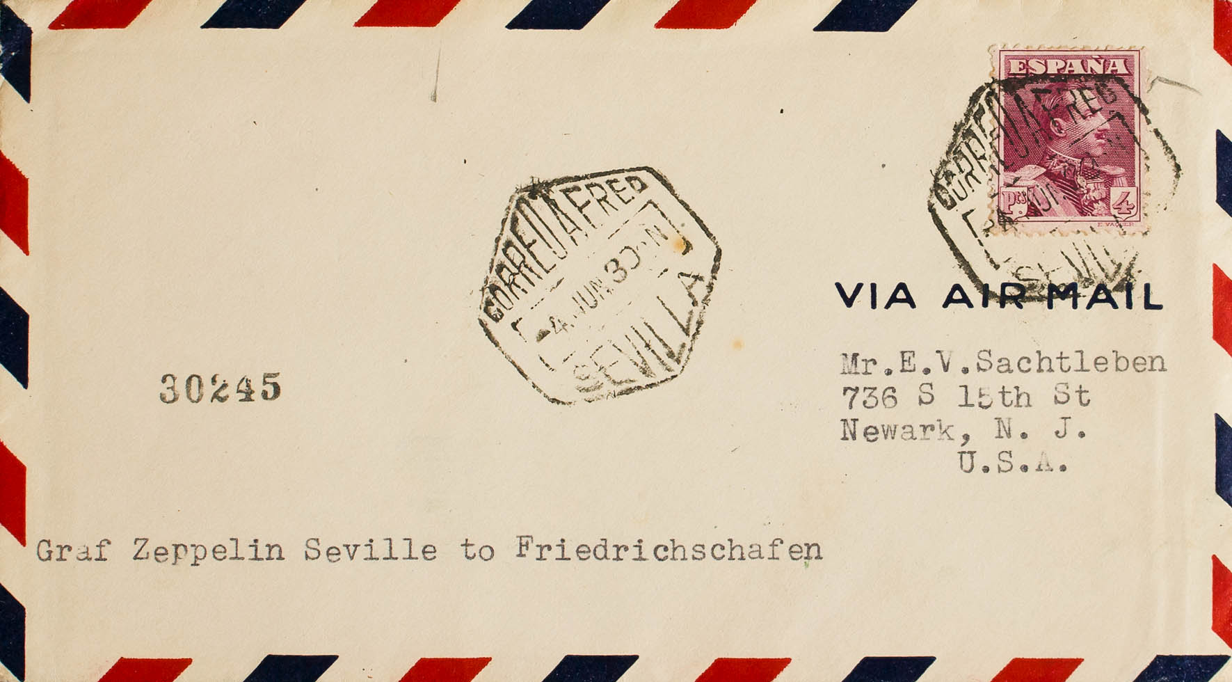 322. 1930. 4 pts carmÃn. Graf Zeppelin de SEVILLA a NEWARK (USA). Al dorso llegada. MAGNIFICA.