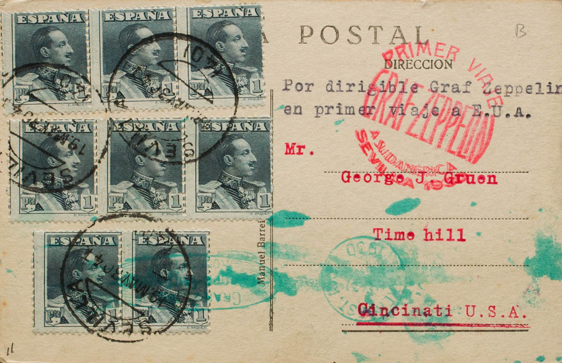 321(8). 1930. 1 pts pizarra, ocho sellos. Tarjeta Postal por Graf Zeppelín de SEVILLA a CINCINATI (U.S.A.). En el frente marca PRIMER VIAJE / GRAF ZEPPELIN / A SUDAMERICA / SEVILLA 1930 y llegada a Lakehurst en verde. MAGNIFICA.