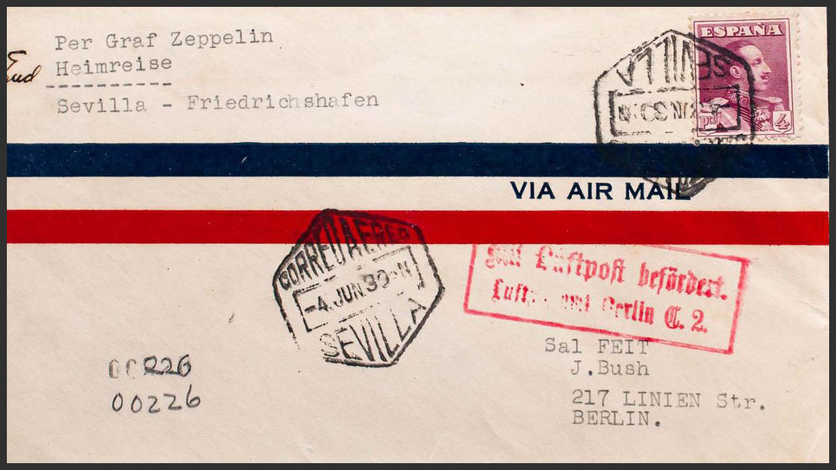 322. 1930. 4 pts carmÃn violeta. Graf Zeppelin de SEVILLA a BERLIN (ALEMANIA). Al dorso tránsito FRIEDRICHSHAFEN y llegada. MAGNIFICA.