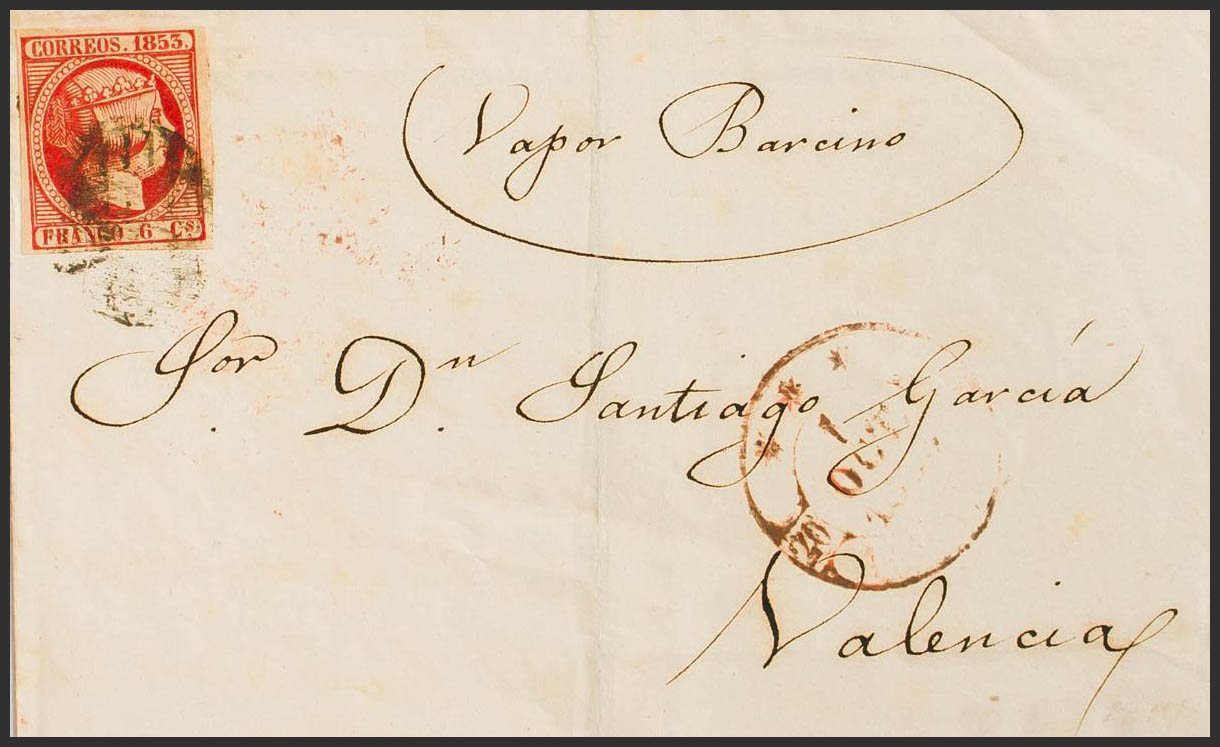 17. 1853. 6 cuartos rosa. ALICANTE a VALENCIA. En el frente manuscrito "Vapor Barcino". MAGNIFICA.