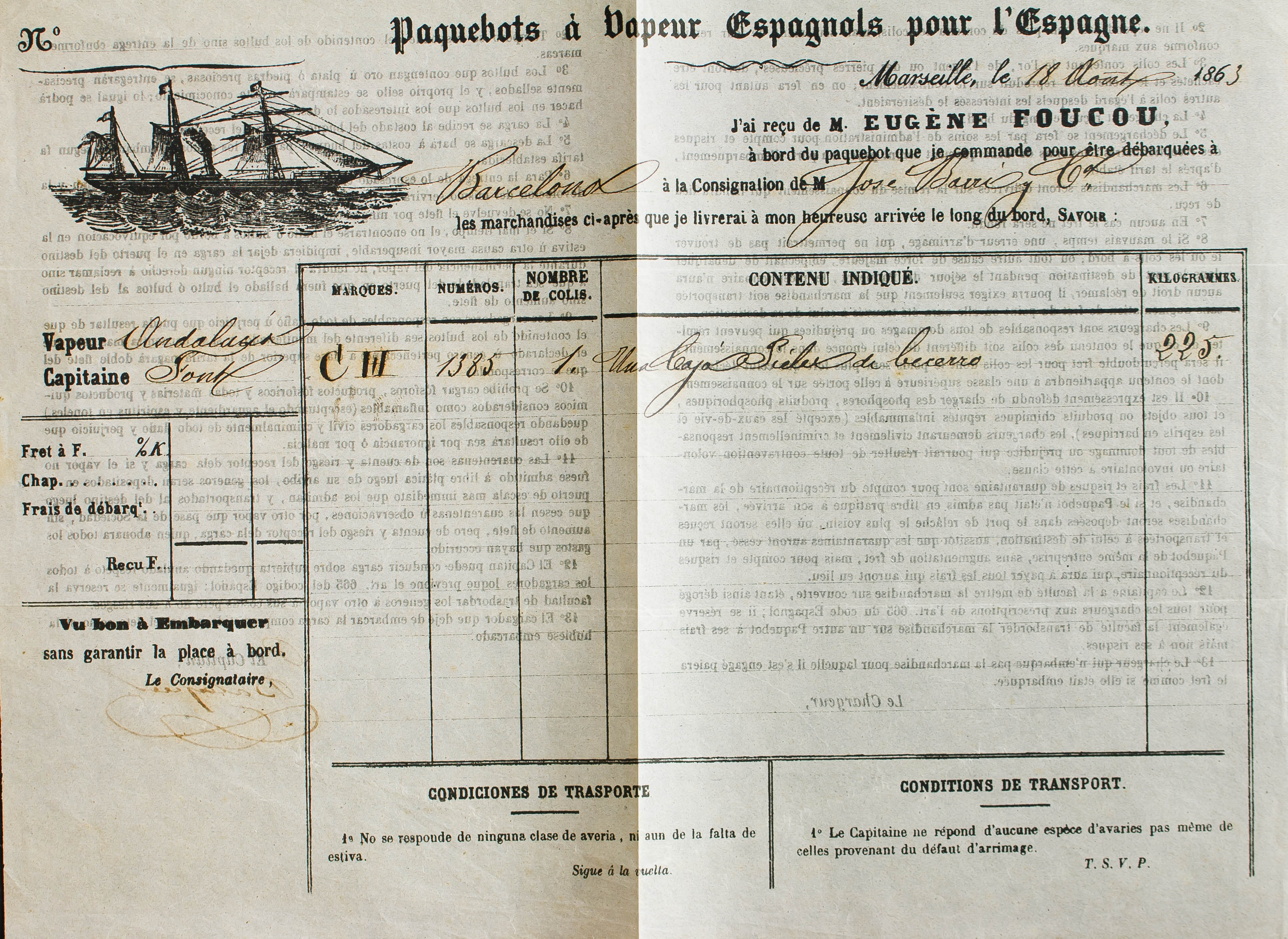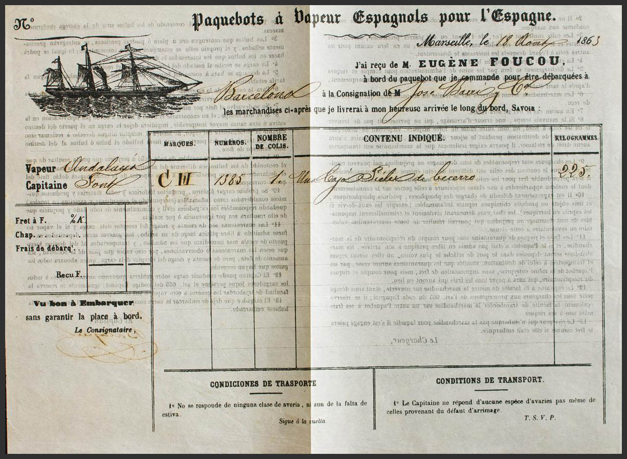 1863. Justificante de transporte de mercancÃas de los PAQUEBOTS A VAPEUR ESPAGNOLS POUR L´ESPAGNE de MARSELLA a BARCELONA. MAGNIFICO Y RARO COMPLETO.