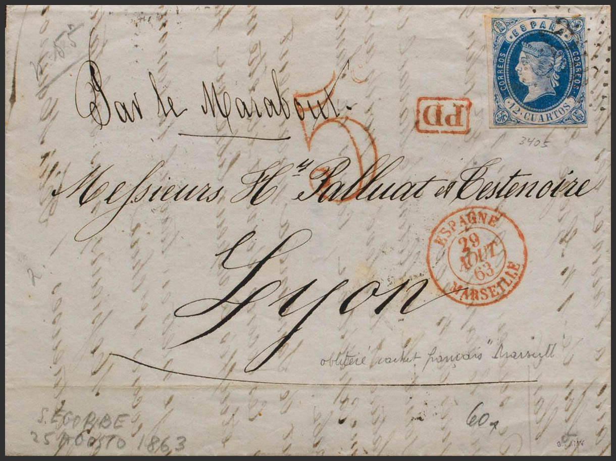 59. 1863. 12 cuartos azul. SEGORBE a LYON (FRANCIA) (carta transportada privadamente hasta Barcelona, donde se deposita en el vapor francés "Le Marabout"). Matasello francés ROMBO DE PUNTOS Nº2240, aplicado en tránsito. MAGNIFICA.