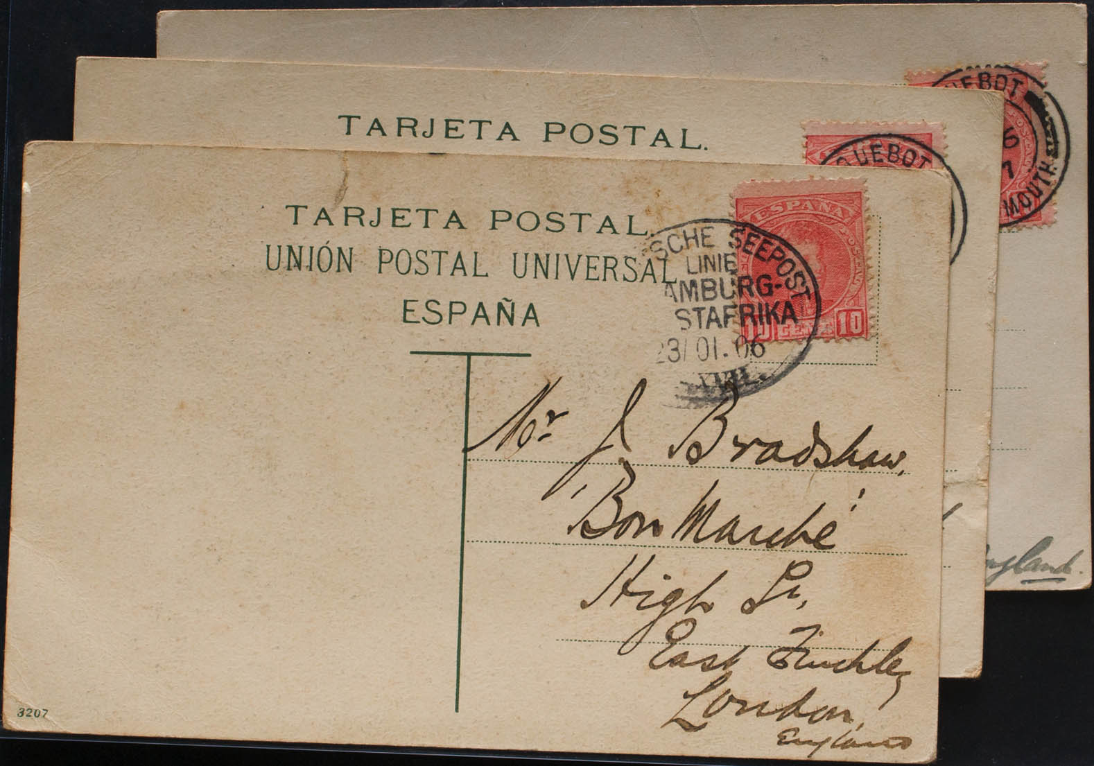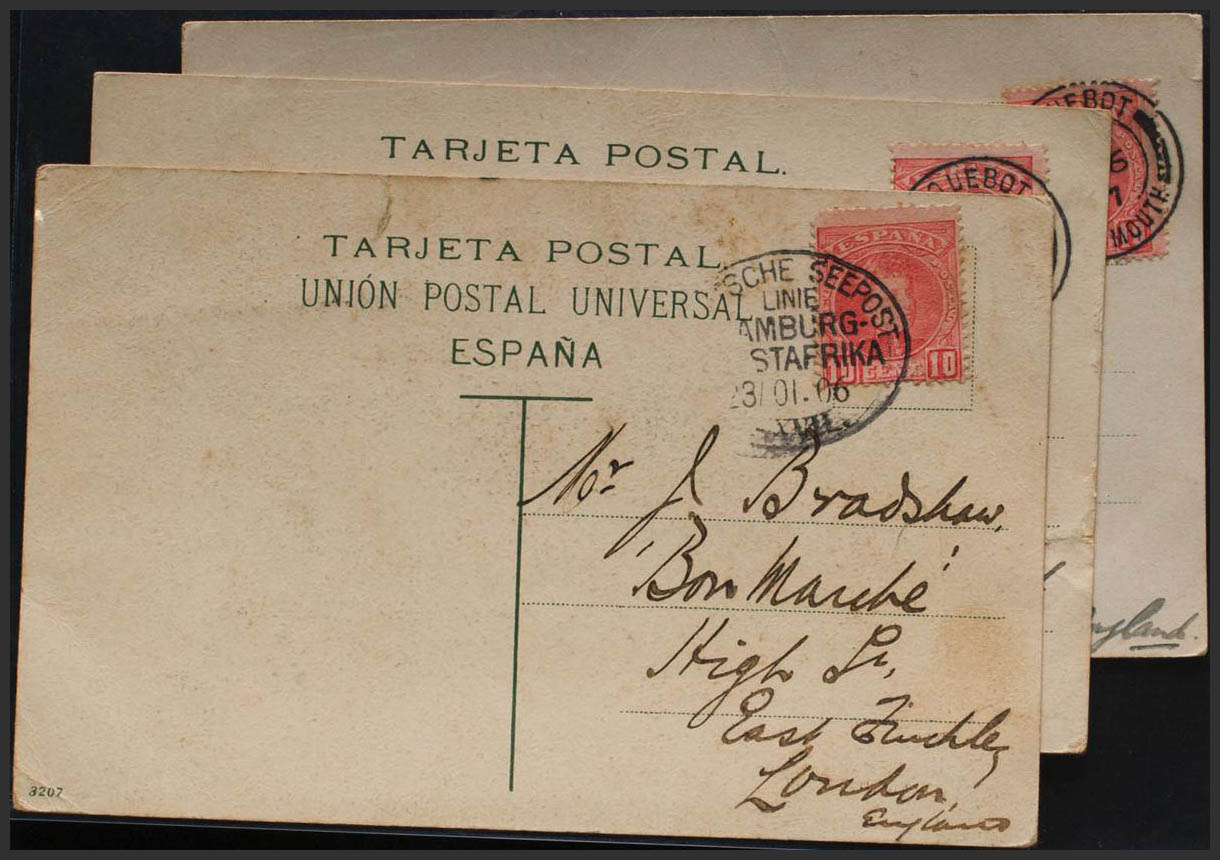 243(3). 1906. Conjunto de tres Tarjetas Postales dirigidas a INGLATERRA, dos de ellas con matasello PAQUEBOT / PLYMOUTH y una con matasello DEUTSCHE SEE POST / LINIE / HAMBURG / OSTAFRICA. MAGNIFICO CONJUNTO.